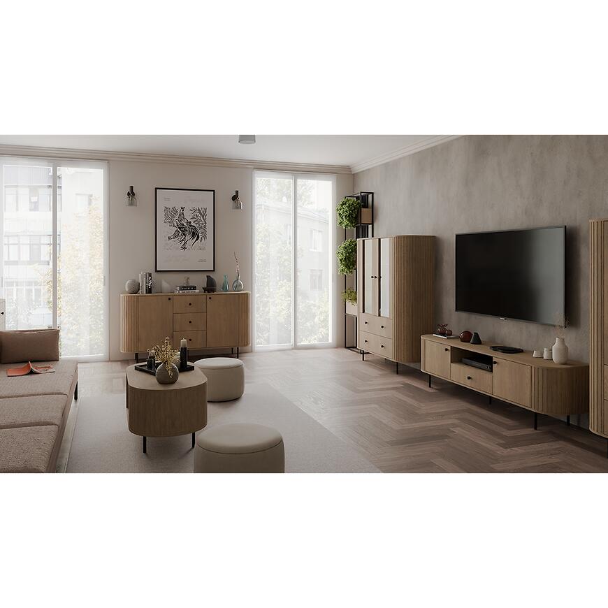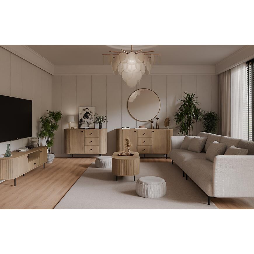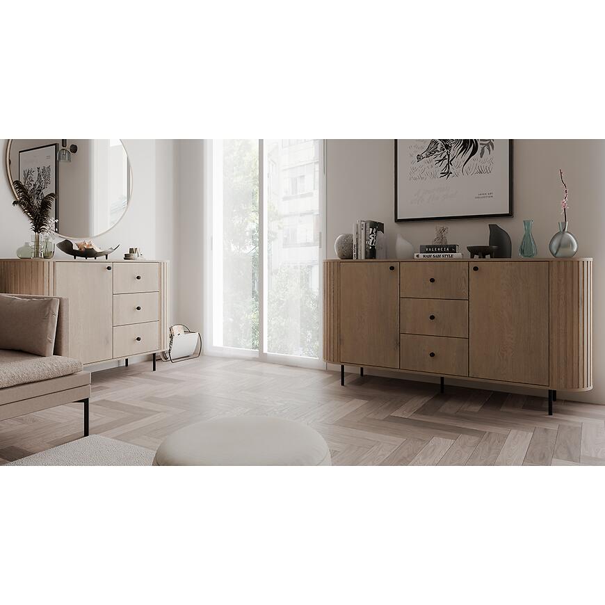Komoda Ovalio 823 2D 3S Dąb Cremona sprawdzi się w nowoczesnych wnętrzach, oferując wygodę, estetykę i praktyczne rozwiązania. Mebel wymaga złożenia, co ułatwia transport i montaż.