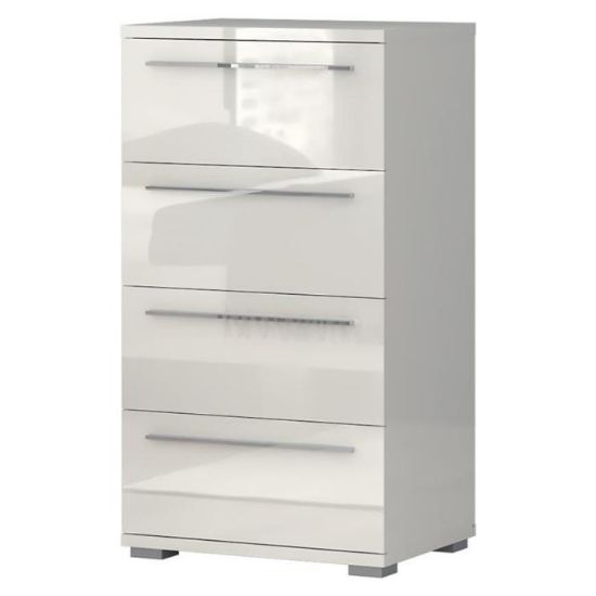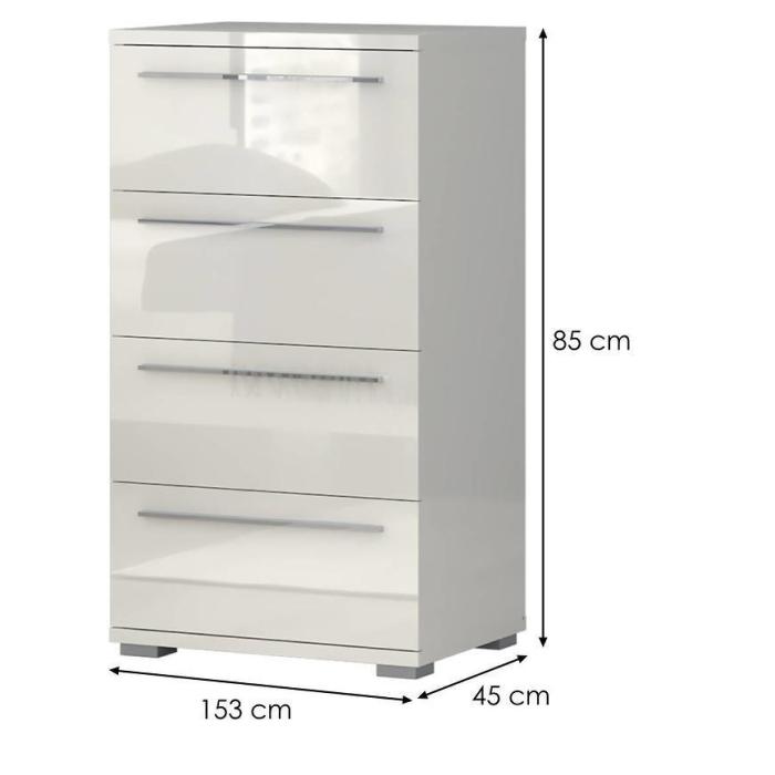 Komoda z kolekcji Piano to doskonała propozycja do pokoju dziennego i salonu. Doskonale sprawdzi się również w sypialni. Posiada cztery pojemne szuflady, dzięki którym zyskujemy dodatkowe miejsce do przechowywania i uporządkowania przestrzeni. Fronty i korpusy wykonane z płyty wiórowej lakierowanej. Komoda Piano oferuje funkcjonalne wnętrze, a ponadto wyróżnia się nowoczesnym stylem.