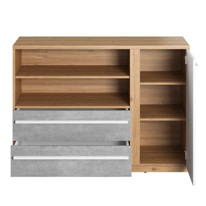 Klasyczna komoda Plano to mebel idealny do pokoju młodzieżowego. Wpasuje się w wiele aranżacji w nowoczesnych wnętrzach jak również we wnętrzach klasycznych. Szafka posiada szuflady, półki i drzwiczki dzięki czemu ma łatwy dostęp do wnętrza oraz odpowiednią przestrzeń do przechowywania odzieży. Płyta wiórowa to płyta z której wykonano komodę. Do kompletu można dokupić inne meble z kolekcji.