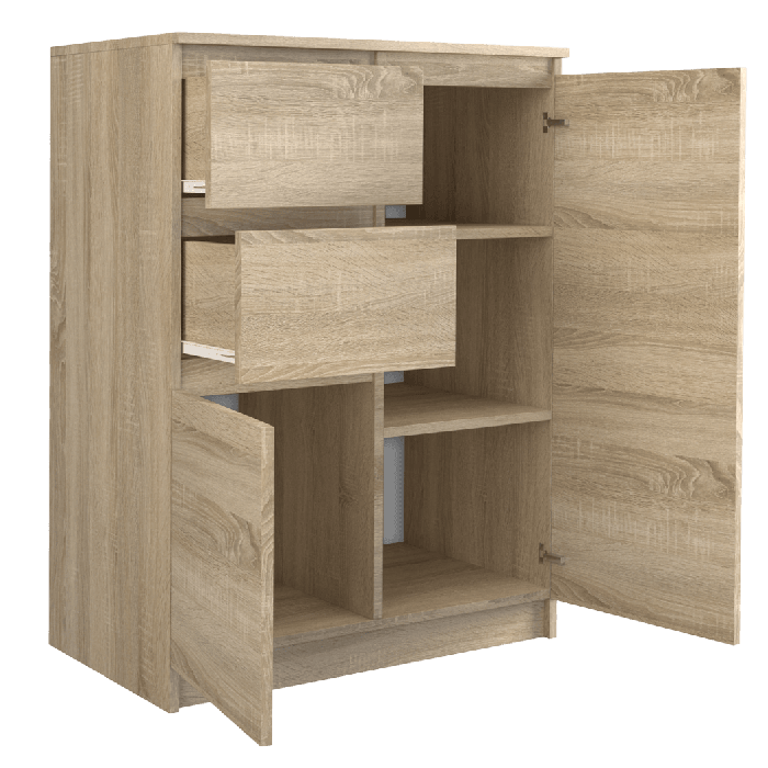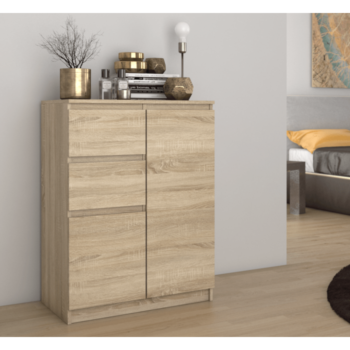 Komoda Portos to prosta, uniwersalna i pojemna bryła, którą wyróżnia również bardzo ergonomiczna konstrukcja. Dwie szuflady oraz dwie szafki dają dużą przestrzeń do przechowywania. Bezuchwytowe fronty szuflad oraz drzwi zapewniają wygodne użytkowanie. Komoda posiada funkcjonalny blat, który można wykorzystać np. charakterze miejsca na telewizor (szczególnie w pomieszczeniach, w których nie ma przestrzeni na tradycyjną szafkę RTV). Idealna komoda do salonu w stylu scandi, nowoczesnej sypialni lub pokoju dziecięcego! Płyta laminowana o grubości 16 mm zapewnia solidność i wytrzymałość. Mebel do samodzielnego montażu.