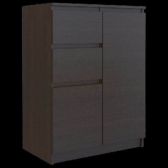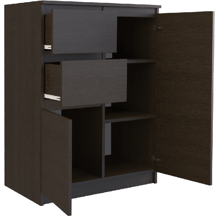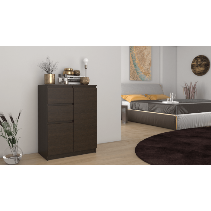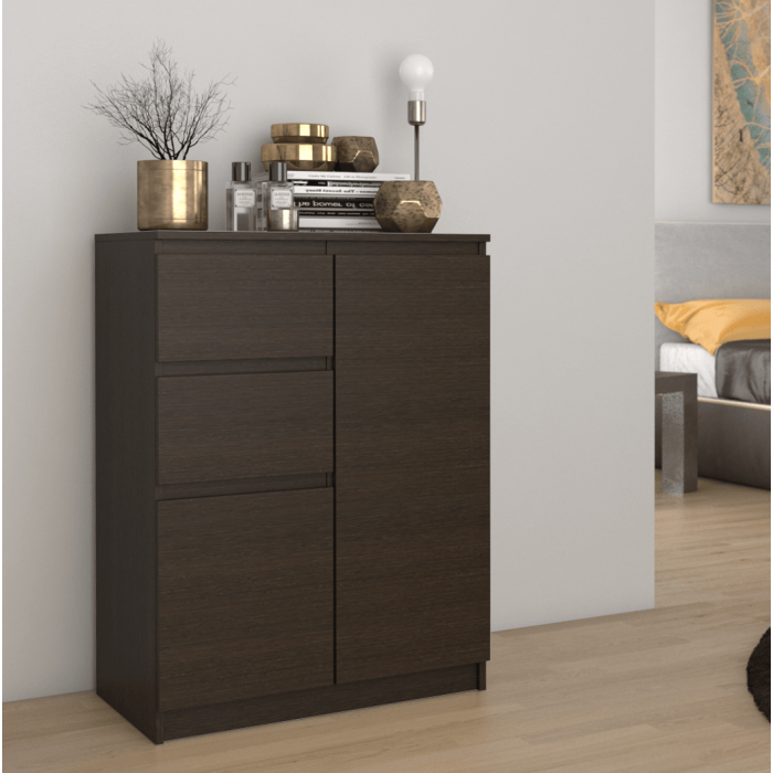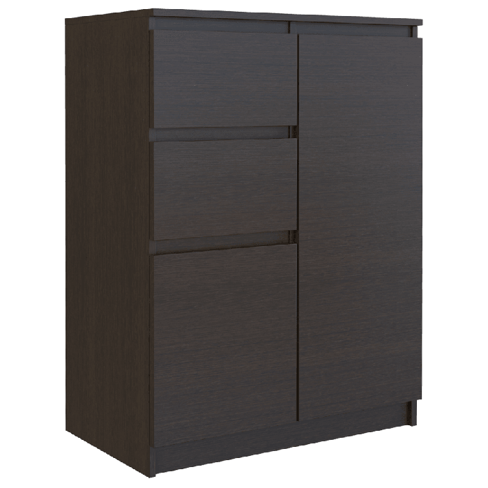 Komoda Portos to prosta, uniwersalna i pojemna bryła, którą wyróżnia również bardzo ergonomiczna konstrukcja. Dwie szuflady oraz dwie szafki dają dużą przestrzeń do przechowywania. Bezuchwytowe fronty szuflad oraz drzwi zapewniają wygodne użytkowanie. Komoda posiada funkcjonalny blat, który można wykorzystać np. charakterze miejsca na telewizor (szczególnie w pomieszczeniach, w których nie ma przestrzeni na tradycyjną szafkę RTV). Idealna komoda do salonu w stylu scandi, nowoczesnej sypialni lub pokoju dziecięcego! Płyta laminowana o grubości 16 mm zapewnia solidność i wytrzymałość. Mebel do samodzielnego montażu.