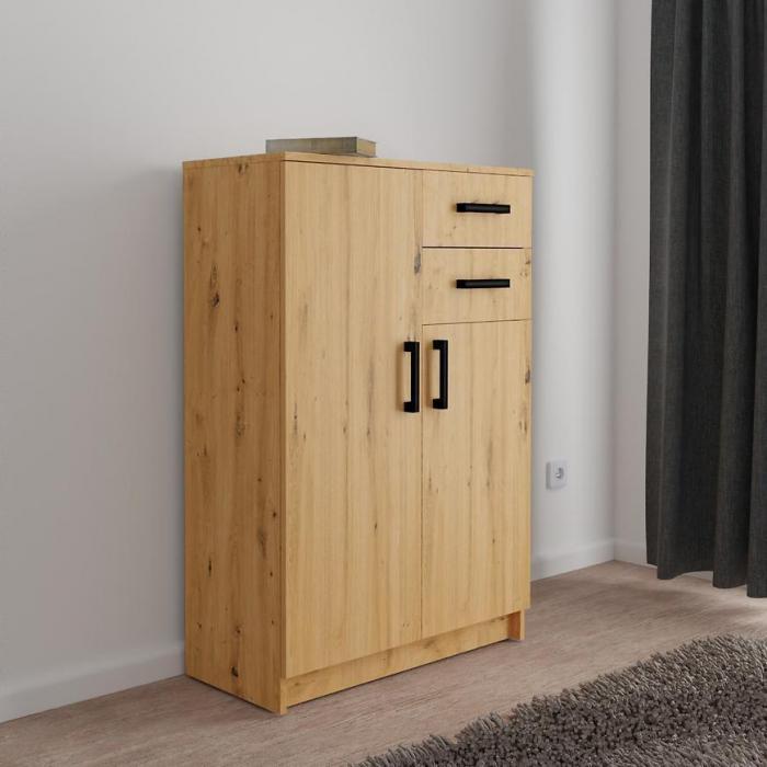 Doskonałym wyborem do pokoju dziennego będzie komoda w kolorze dąb wotan z serii Posejdon, materiał wykonania to płyta laminowana. Komoda posiada drzwiczki oraz szuflady dzięki czemu ma łatwy dostęp do wnętrza. Komoda dopełni również wystrój salonu, czy przedpokoju, stanowiąc wygodne miejsce do przechowywania mniejszych i większych rzeczy. Mebel do samodzielnego montażu.