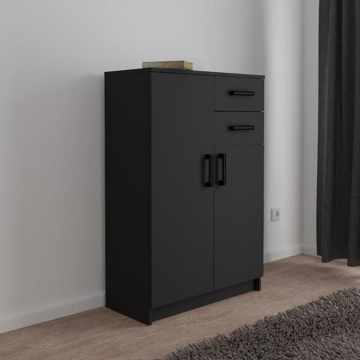 Doskonałym wyborem do pokoju dziennego będzie komoda w kolorze czarnym z serii Posejdon, materiał wykonania to płyta laminowana. Komoda posiada drzwiczki oraz szuflady dzięki czemu ma łatwy dostęp do wnętrza. Komoda dopełni również wystrój salonu, czy przedpokoju, stanowiąc wygodne miejsce do przechowywania mniejszych i większych rzeczy. Mebel do samodzielnego montażu.