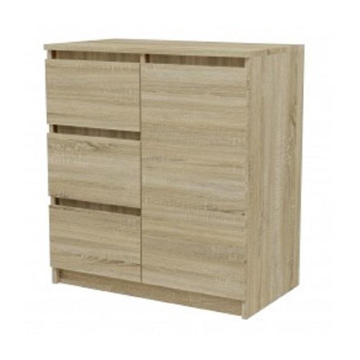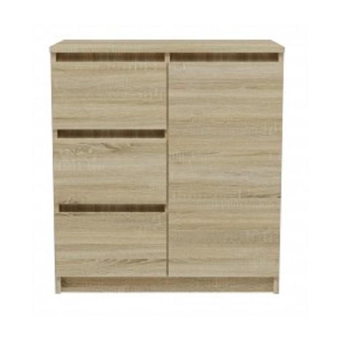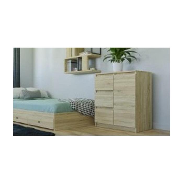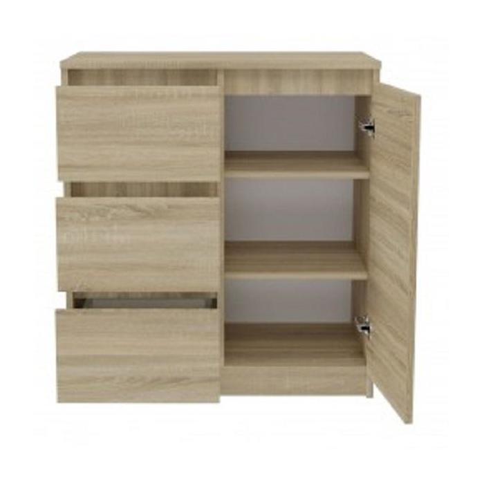 Doskonałym wyborem do pokoju dziennego będzie komoda w kolorze dąb sonoma z serii Poso , materiał wykonania to płyta laminowana. Komoda posiada trzy szuflady, na prowadnicach rolkowych oraz jedną szafkę dzięki czemu ma łatwy dostęp do wnętrza. Komoda dopełni również wystrój salonu, czy przedpokoju, stanowiąc wygodne miejsce do przechowywania mniejszych i większych rzeczy. Mebel do samodzielnego montażu.