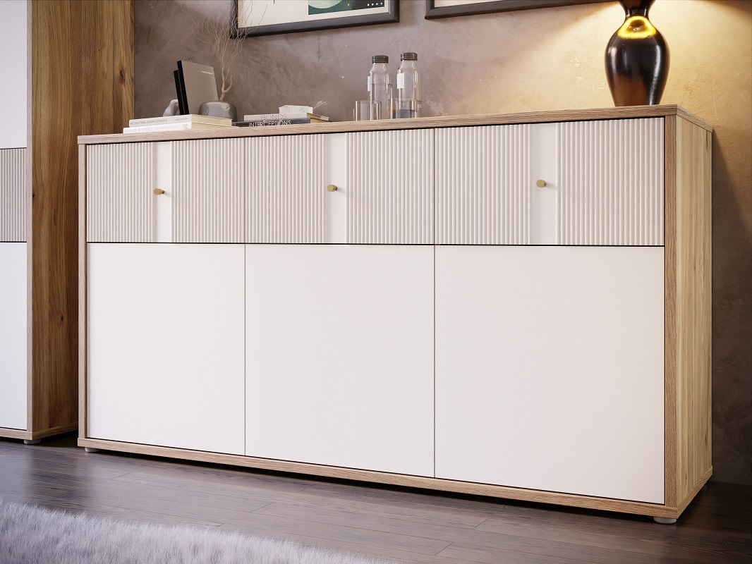 Fronty komody Risso RNKK232 zdobią subtelne elementy dekoru piaskowego, które w połączeniu z ryflowanym MDF-em tworzą unikatowy i przyciągający wzrok wzór. Trzydrzwiowa konstrukcja komody, wyposażona w drzwi uchylne, zapewnia łatwy dostęp do przechowywanych przedmiotów. Wewnątrz znajdziesz trzy przestronne półki, które umożliwiają praktyczne rozplanowanie miejsca na różnorodne akcesoria, od zastawy stołowej po dekoracyjne bibeloty.