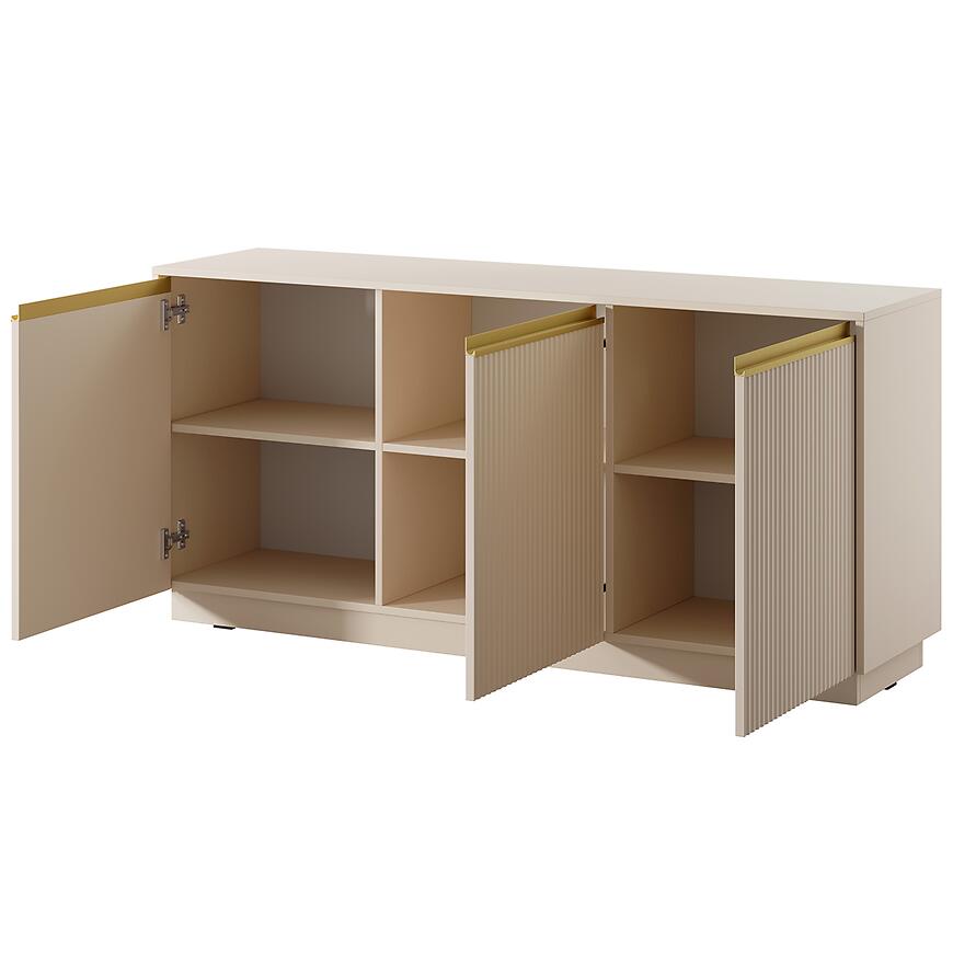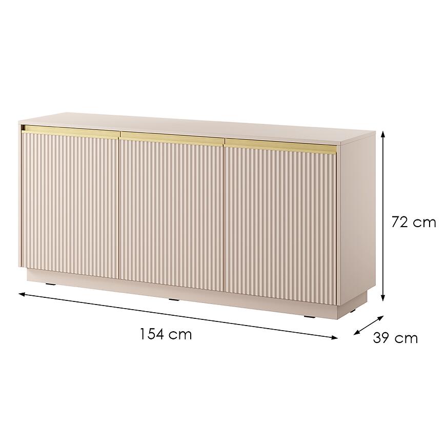 Komoda Royal K154 Beż Piaskowy to nowoczesny i elegancki mebel wykonany z laminowanej płyty wiórowej z matowym wykończeniem frontów i korpusu. Model trzydrzwiowy o wymiarach (154x72x39 cm) zapewnia praktyczną przestrzeń do przechowywania. Minimalistyczny design łączy trwałość z funkcjonalnością. To połączenie stylu, jakości i praktyczności, które wyróżni każde wnętrze.