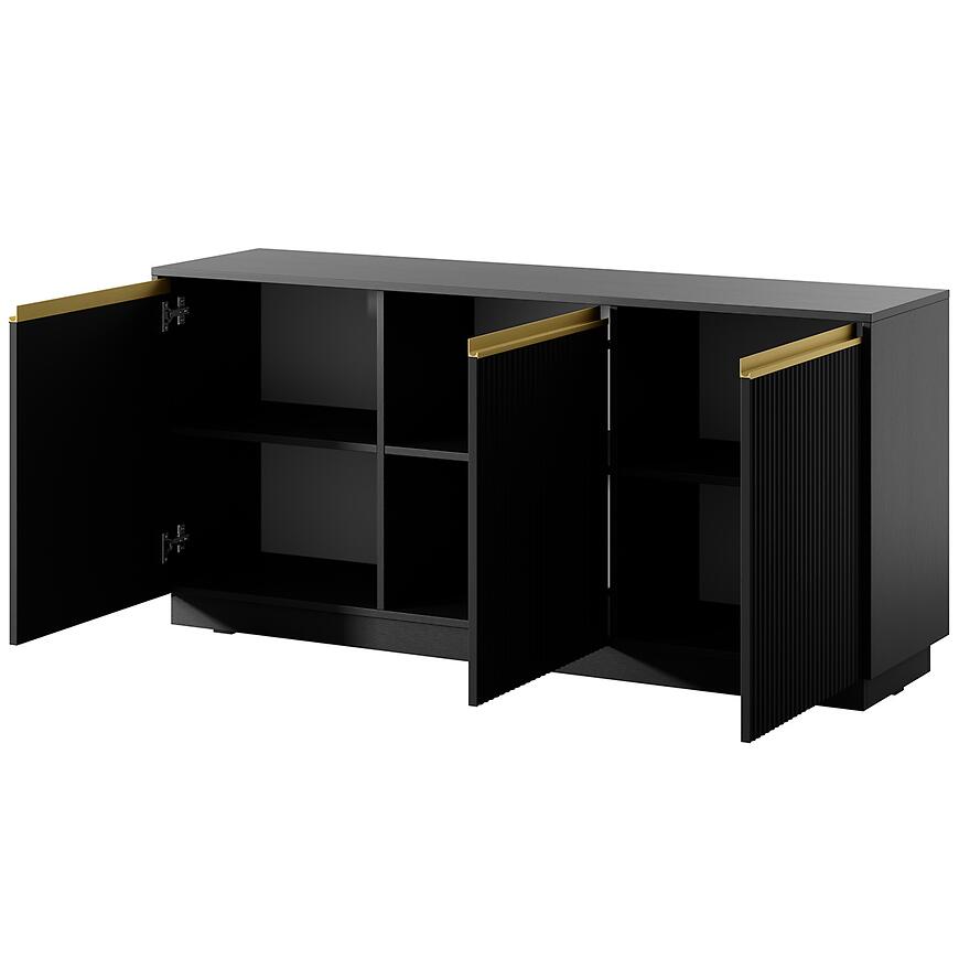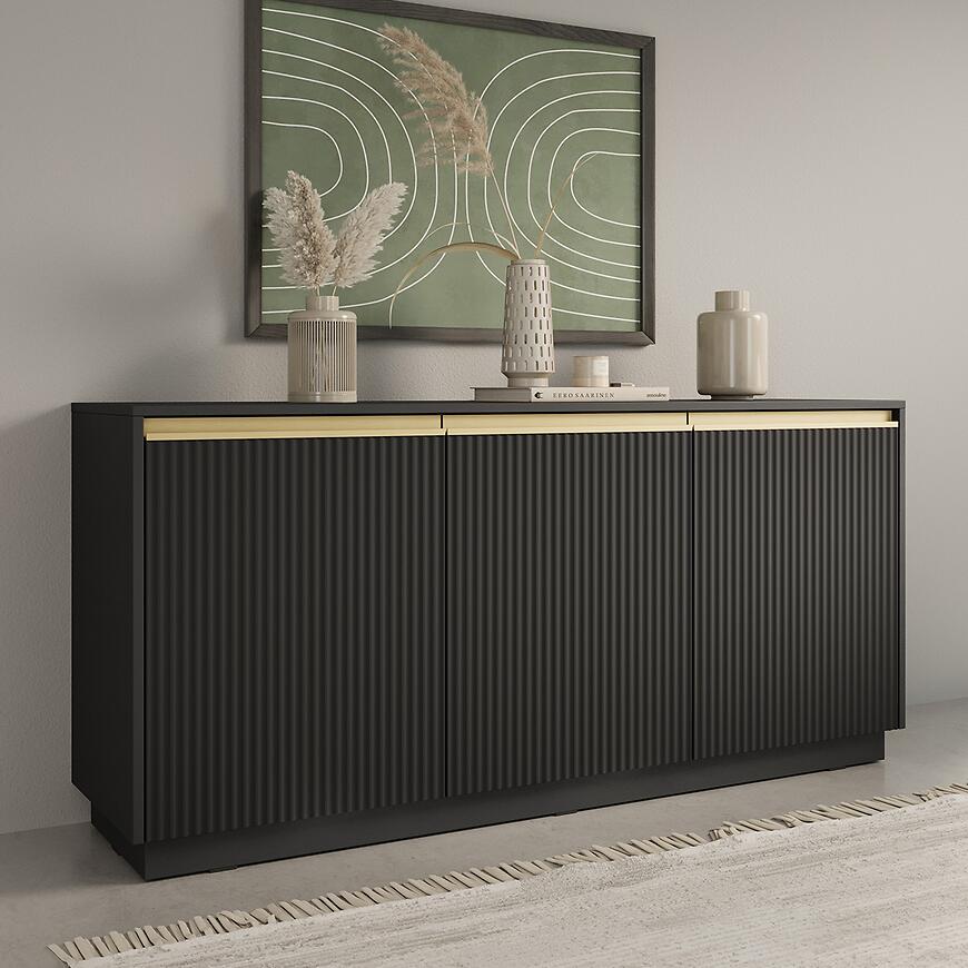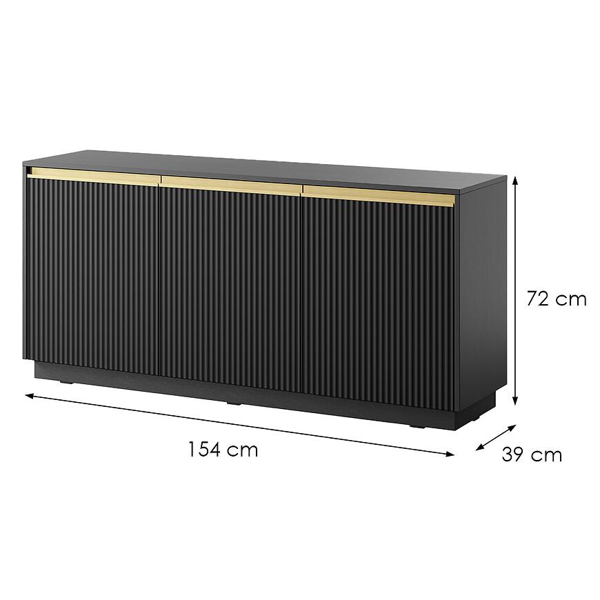 Komoda Royal K154 Czarny to nowoczesny i elegancki mebel wykonany z laminowanej płyty wiórowej z matowym wykończeniem frontów i korpusu. Model trzydrzwiowy o wymiarach (154x72x39 cm) zapewnia praktyczną przestrzeń do przechowywania. Minimalistyczny design łączy trwałość z funkcjonalnością. To połączenie stylu, jakości i praktyczności, które wyróżni każde wnętrze.