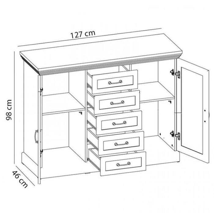 Komoda to przede wszystkim nowoczesność i funkcjonalność w jednym. Mebel doskonale sprawdzi się w każdym salonie. Materiał wykonania to płyta wiórowa laminowana/płyta MDF. Komoda posiada pięć szuflad i dwie szafki dzięki czemu ma łatwy dostęp do wnętrza. Wygląd mebli jest nowoczesny, a zarazem uniwersalny. Mebel będzie pasował do wielu pomieszczeń jak np. jadalni czy pokoju dziennego. Meble jest bardzo pojemny, dlatego sprawdzi się w każdym pomieszczeniu - zarówno w sypialni, pokoju dziennym, młodzieżowym, czy też salonie. Mebel do samodzielnego montażu.