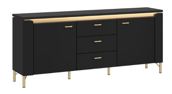 Jednym z najbardziej wyróżniających elementów komody RTV Norica 2D3S jest zintegrowane oświetlenie LED TREND, które podkreśla luksusowy charakter mebla i wprowadza do wnętrza przyjemny, nastrojowy klimat. Delikatna poświata światła LED eksponuje eleganckie wykończenie czarnych powierzchni oraz złotych detali, sprawiając, że komoda staje się centralnym punktem aranżacji salonu, szczególnie wieczorową porą.
