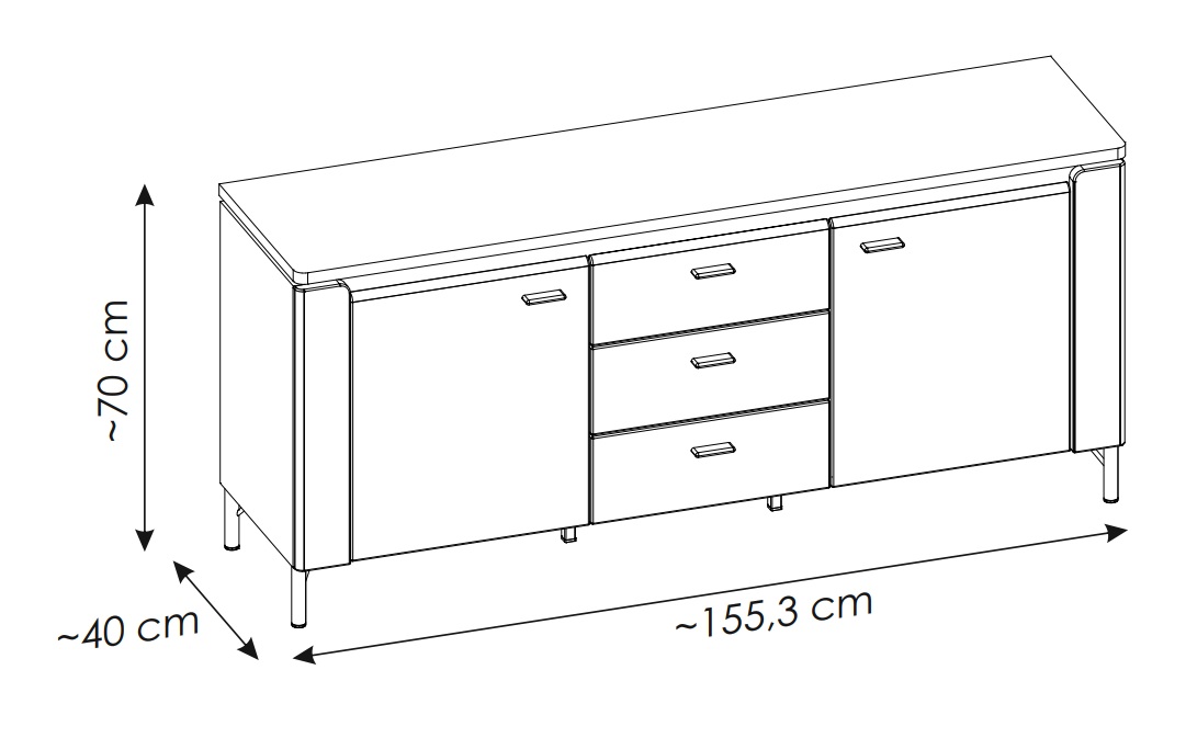 Bryła komody o szerokości 155,3 cm, wysokości 70 cm i głębokości 40 cm została zaprojektowana tak, aby łączyć estetykę z praktycznością. Mebel wyposażono w trzy pojemne szuflady, które poruszają się na prowadnicach kulkowych z pełnym wysuwem, co ułatwia dostęp do przechowywanych przedmiotów. Dodatkowo znajdują się w nim dwie zamykane szafki z zawiasami cichodomykającymi się, gwarantującymi płynne i bezgłośne zamykanie drzwiczek. Dzięki temu komoda jest idealnym miejscem na przechowywanie sprzętu RTV, dokumentów, płyt czy akcesoriów multimedialnych.