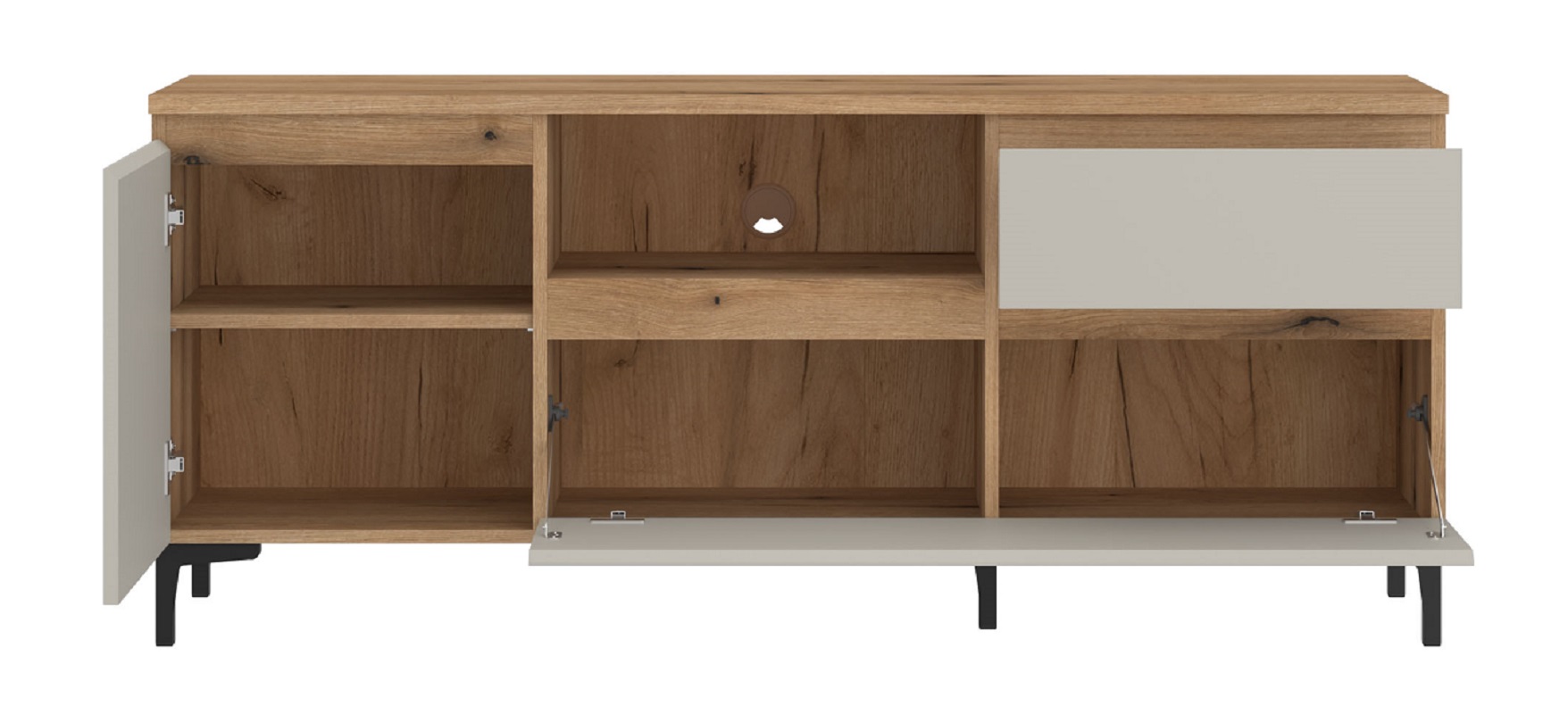 Komoda RTV Exeter EXXPF03 to nie tylko praktyczne rozwiązanie do przechowywania sprzętu multimedialnego, ale również designerski element, który wkomponuje się doskonale w aranżację Twojego pokoju dziennego. Wykonana z trwałej płyty laminowanej, gwarantuje solidność i trwałość, przy jednoczesnej łatwości utrzymania w czystości. Kolor korpusu w ciepłym odcieniu dębu coast evoke wprowadza do wnętrza przyjemną atmosferę naturalnej elegancji.