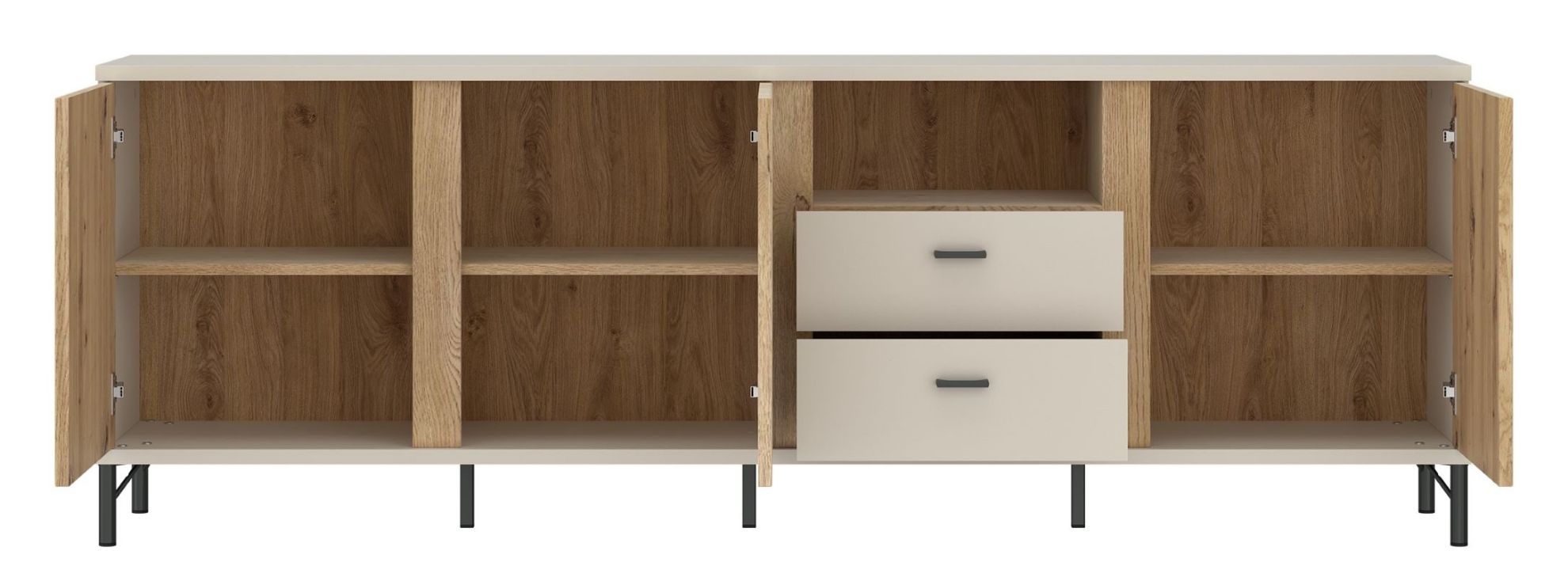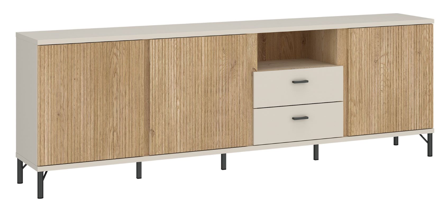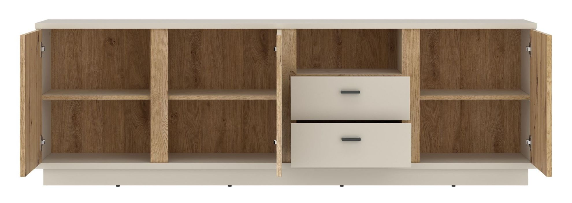 Model sprawdzi się jako centrum strefy telewizyjnej, ale może pełnić także funkcję praktycznego mebla do przechowywania w pokoju dziennym. Dzięki dużej szerokości i zróżnicowanemu układowi przechowywania komoda pomaga utrzymać porządek, jednocześnie stanowiąc efektowny element aranżacji.