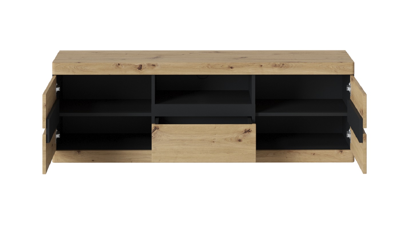 Komoda RTV Turino TURF02 posiada dwudrzwiową konstrukcję, która zapewnia dużo miejsca do przechowywania. Wnętrze komody zostało starannie zaprojektowane tak, aby pomieścić wszystkie urządzenia RTV, takie jak telewizor, konsola do gier czy odtwarzacz multimedialny. Dodatkowo, dwie półki umożliwiają organizację kabli i akcesoriów w porządku.