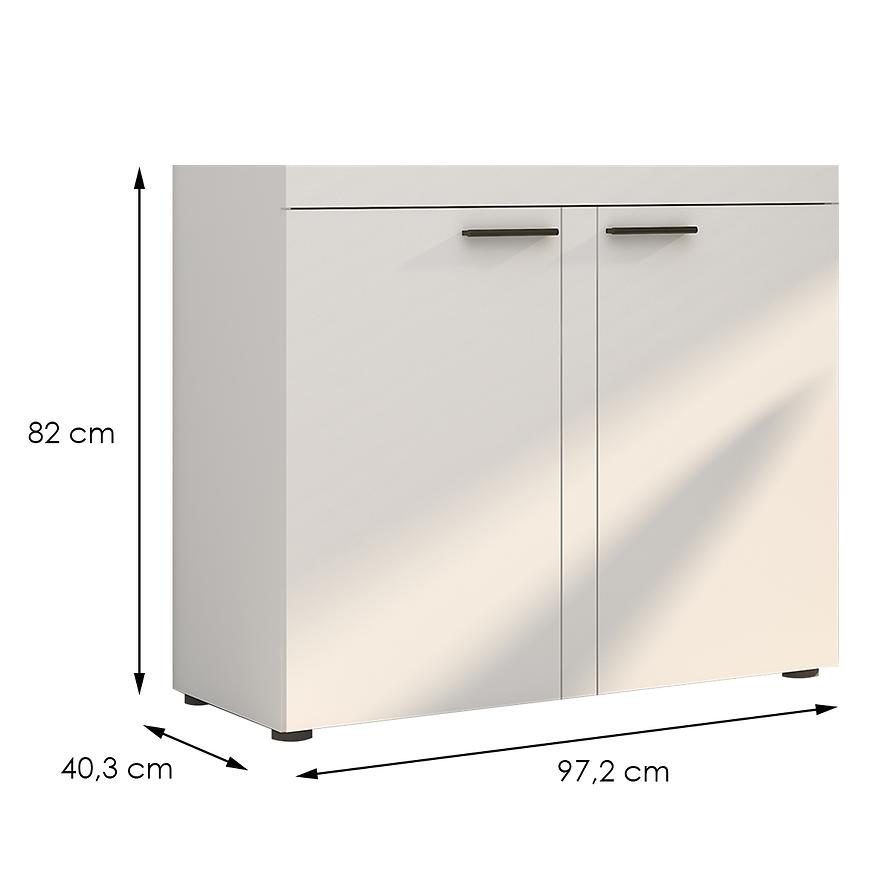Jej matowe wykończenie nadaje meblowi nowoczesny wygląd, jednocześnie zachowując subtelną elegancję. Konstrukcja komody opiera się na wysokiej jakości płycie wiórowej laminowanej, co gwarantuje trwałość i stabilność.