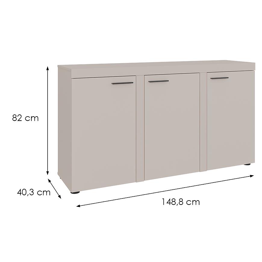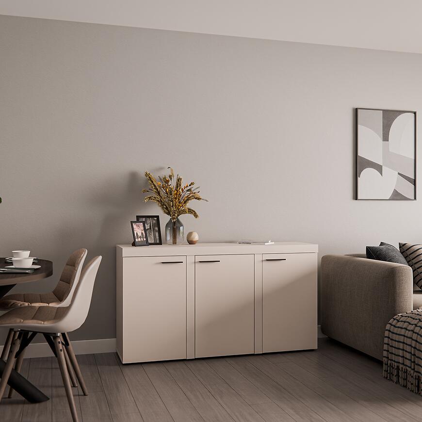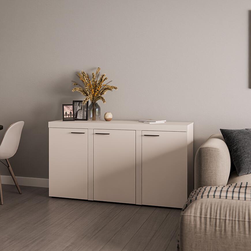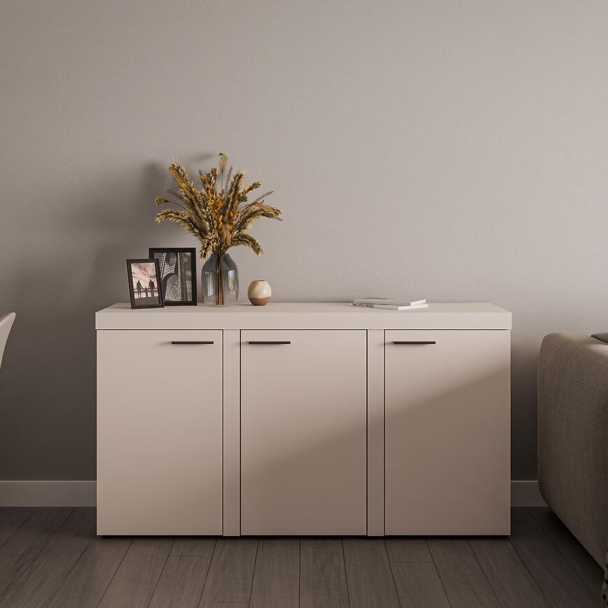 Trzydrzwiowa konstrukcja o szerokości 148,8 cm, wysokości 82 cm i głębokości 40,3 cm oferuje przestronne wnętrze do przechowywania książek, dekoracji, tekstyliów i codziennych akcesoriów. Komoda Rumba 3F BP22 beż piaskowy łączy estetykę z praktycznością, idealnie wpisując się w nowoczesne aranżacje wnętrz.