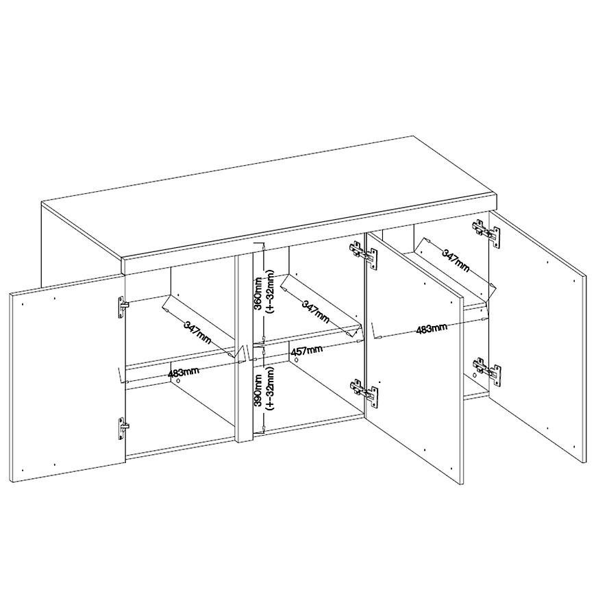 Trzydrzwiowe fronty zapewniają wygodny dostęp do wnętrza komody, umożliwiając przechowywanie większych przedmiotów w sposób uporządkowany i wygodny.