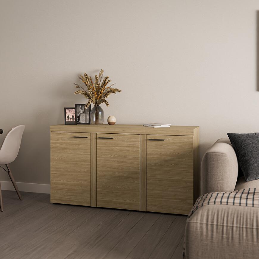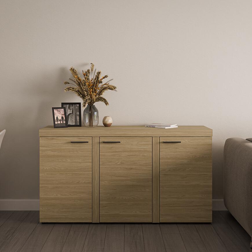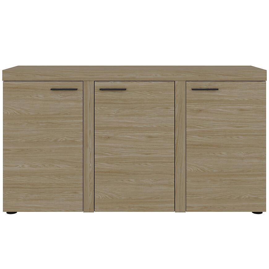 Trzydrzwiowe fronty zapewniają wygodny dostęp do wnętrza komody, umożliwiając wygodne przechowywanie większych przedmiotów i akcesoriów w jednym miejscu. Neutralny odcień dębu olejowanego łatwo komponuje się z nowoczesnymi aranżacjami wnętrz, wprowadzając przytulny, naturalny klimat.