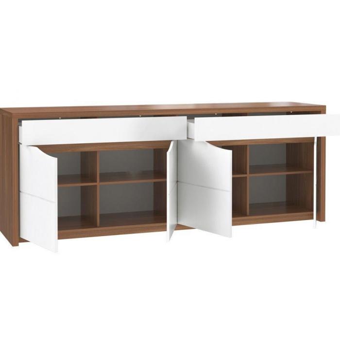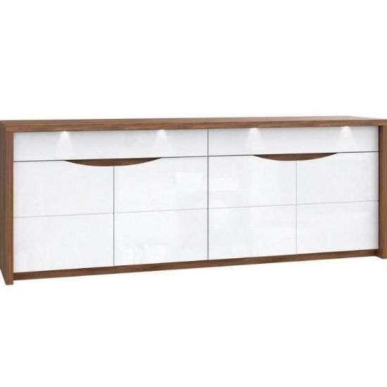 Doskonałym wyborem do pokoju dziennego będzie komoda w kolorze biały połysk/dąb sangallo z serii Saint Tropez, materiał wykonania to płyta wiórowa + folia, obrzeża ABS. Komoda posiada drzwiczki oraz szuflady, dzięki czemu ma łatwy dostęp do wnętrza. Komoda dopełni również wystrój salonu, czy przedpokoju, stanowiąc wygodne miejsce do przechowywania mniejszych i większych rzeczy. Dodatkowym atutem jest oświetlenie w zestawie. Mebel do samodzielnego montażu.