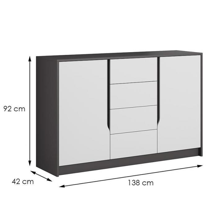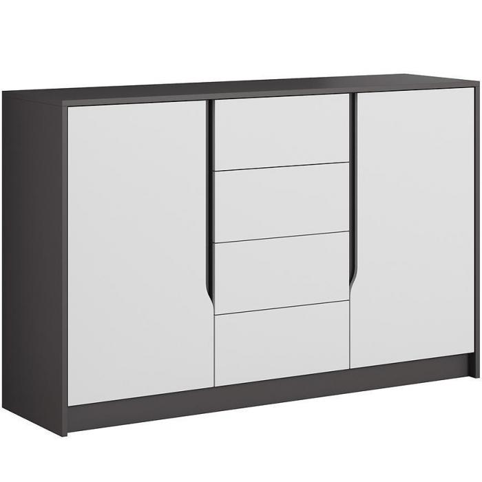 Doskonałym wyborem do pokoju dziennego będzie komoda w kolorze szary grafit/biały z kolekcji Sega, materiał wykonania to płyta laminowana. Komoda posiada dwie szafki oraz cztery szuflady dzięki czemu ma łatwy dostęp do wnętrza. Komoda dopełni również wystrój salonu, czy przedpokoju, stanowiąc wygodne miejsce do przechowywania mniejszych i większych rzeczy. Mebel do samodzielnego montażu.