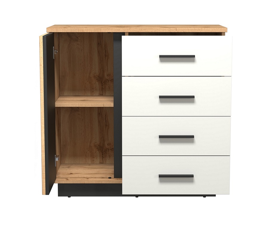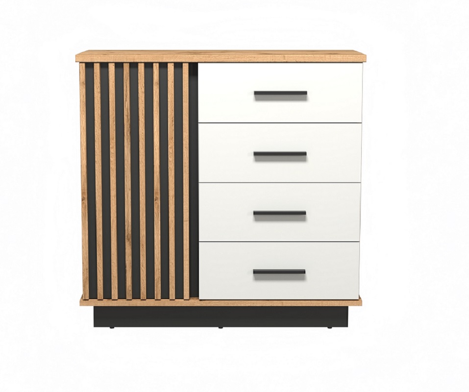 Komoda Santo 2 wyposażona jest w cztery pojemne szuflady oraz jedną półkę, co pozwala na przechowywanie i porządkowanie różnorodnych przedmiotów, od ubrań po książki i drobiazgi. Dzięki temu, Twoje rzeczy zawsze będą miały swoje miejsce, a wnętrze będzie utrzymane w porządku i harmonii.