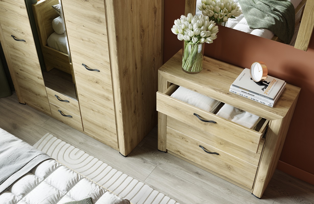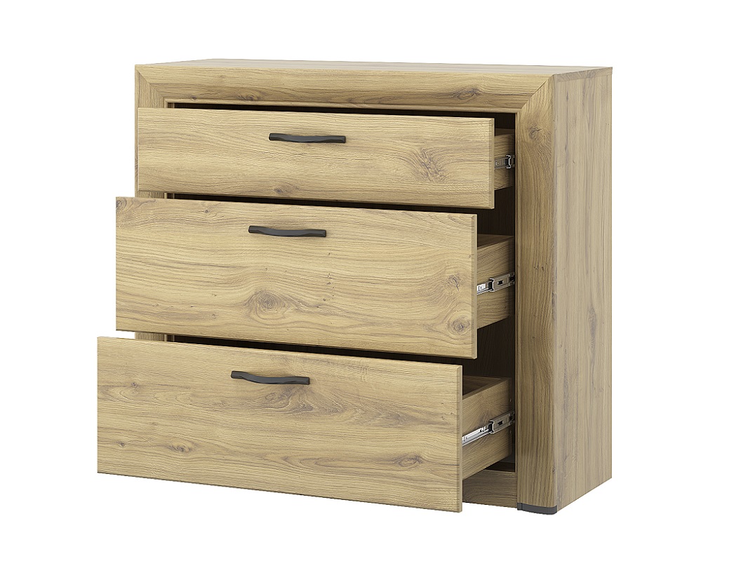 Komoda Sapori 3S charakteryzuje się trzema obszernymi szufladami, które zapewniają dużą przestrzeń do przechowywania. Szuflady te, oparte na prowadnicach kulkowych z pełnym wysuwem, umożliwiają łatwy dostęp do ich zawartości. Dzięki temu, codzienne korzystanie z komody staje się niezwykle wygodne, a przechowywanie rzeczy - uporządkowane i efektywne.