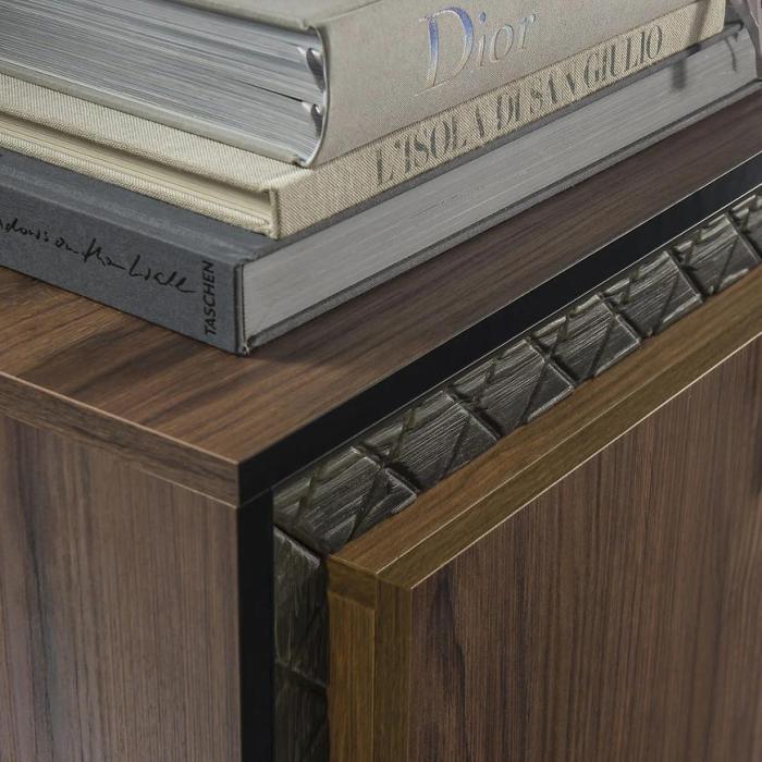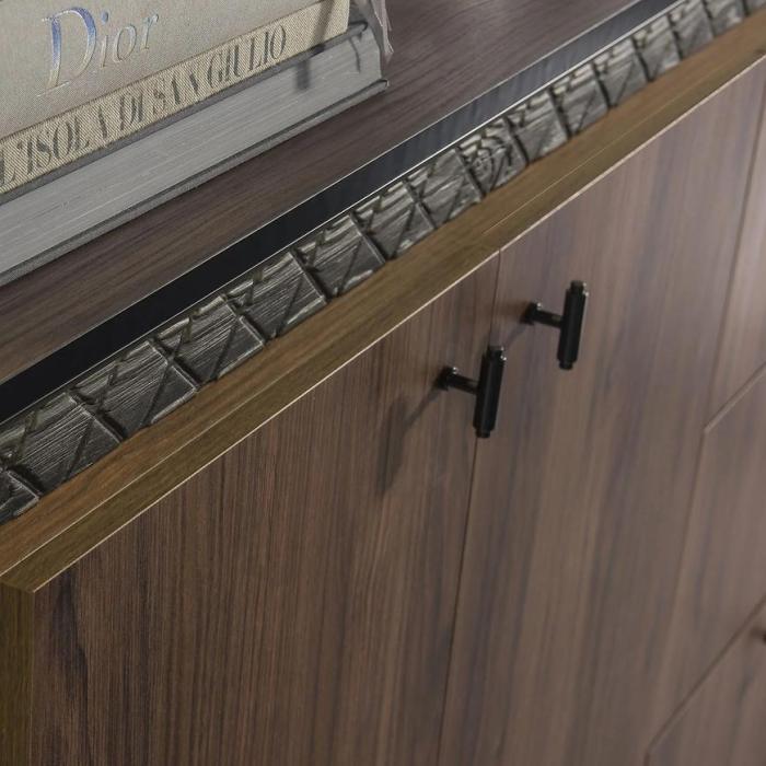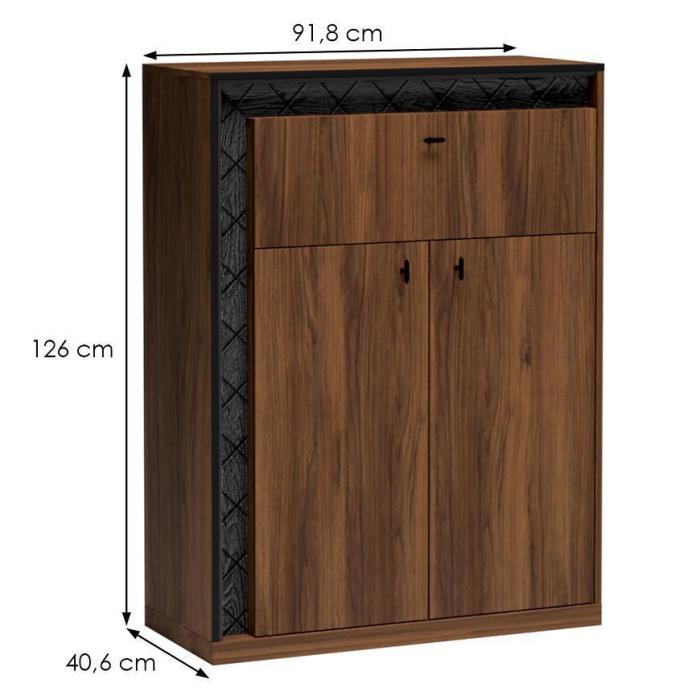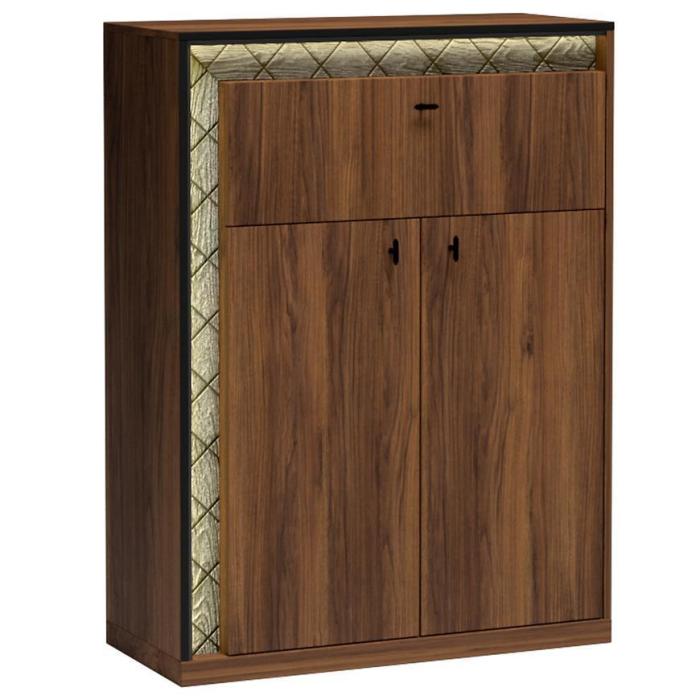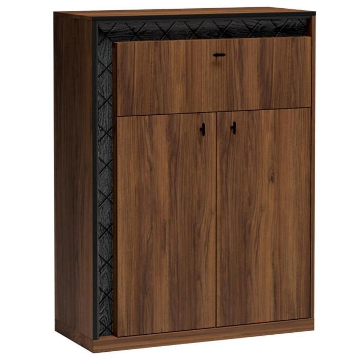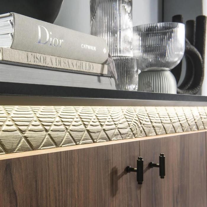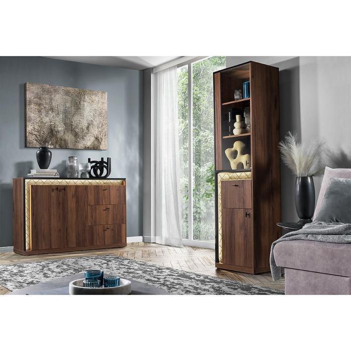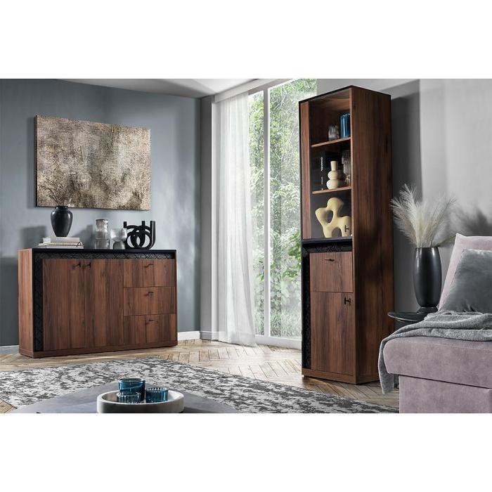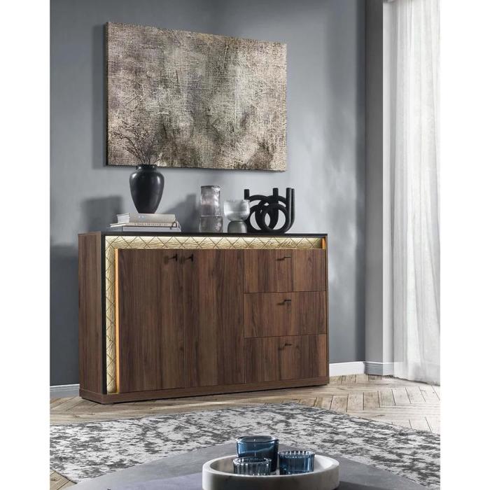 Komoda Sensi w kolorze orzech warmia to przede wszystkim nowoczesność i funkcjonalność w jednym. Mebel doskonale sprawdzi się w każdym salonie. Materiał wykonania to płyta wiórowa laminowana. Komoda posiada jedną szufladę i dwie szafki dzięki czemu ma łatwy dostęp do wnętrza.Czarna, rzeźbiona deska po oświetleniu wygląda jak złoto, które podkreśla orzechowe wybarwienie frontów. Wygląd mebli jest nowoczesny, a zarazem uniwersalny. Mebel będzie pasował do wielu pomieszczeń jak np. jadalni czy pokoju dziennego. Meble jest bardzo pojemny, dlatego sprawdzi się w każdym pomieszczeniu - zarówno w sypialni, pokoju dziennym, młodzieżowym, czy też salonie. Mebel do samodzielnego montażu.