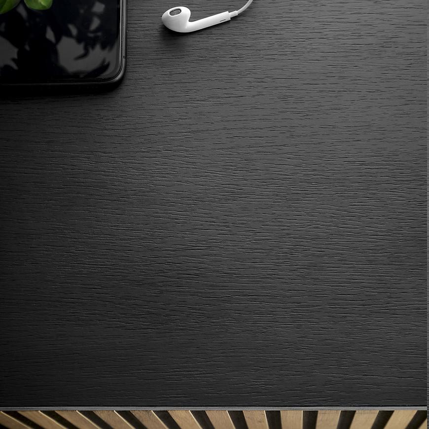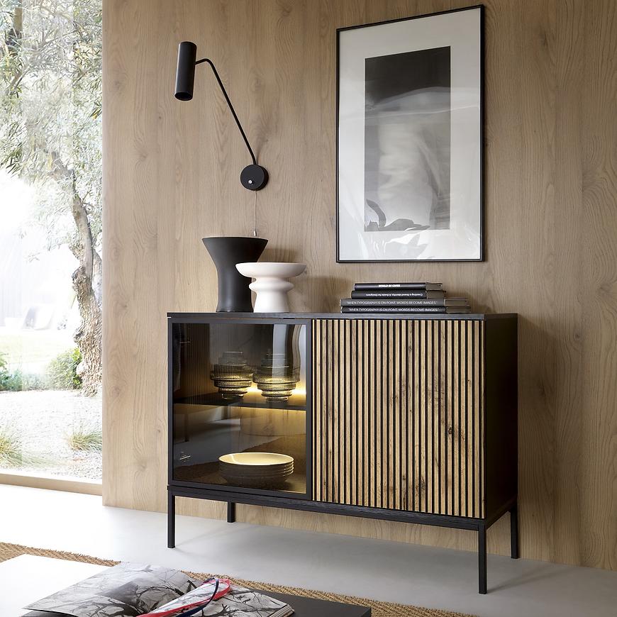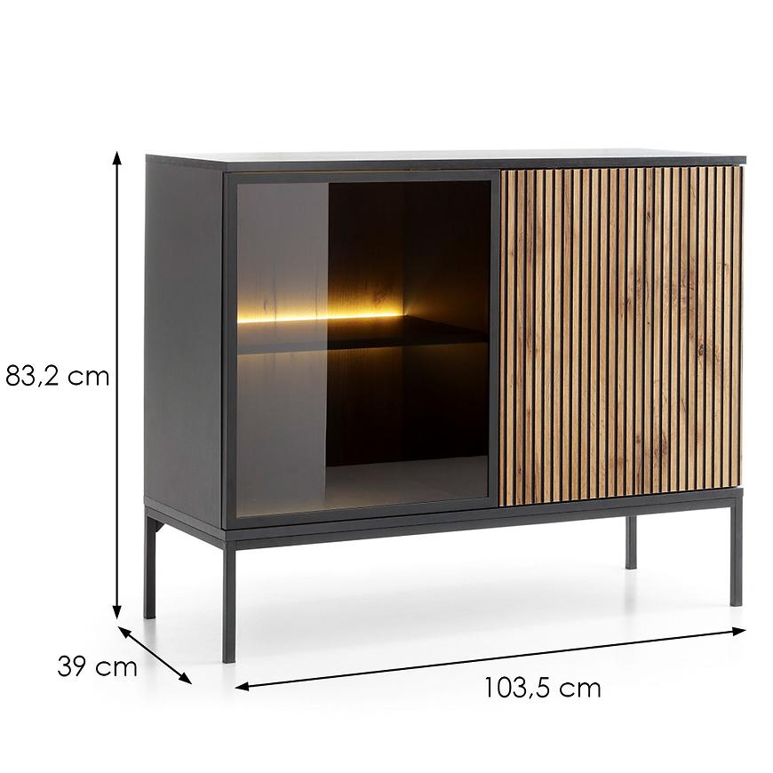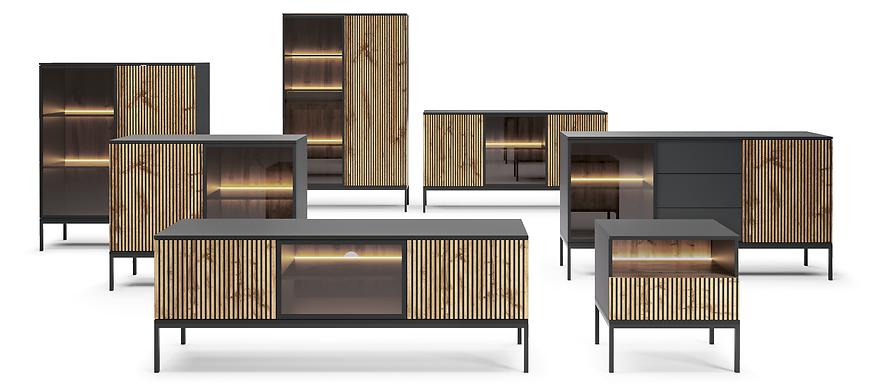 Fronty o ciepłym kolorze dębu wotan kontrastują z czarnym grafitowym korpusem, co nadaje meblowi wyjątkowego charakteru. Wykończenie w matowym stylu dodaje subtelności i elegancji całej kompozycji, podkreślając jej nowoczesny design.