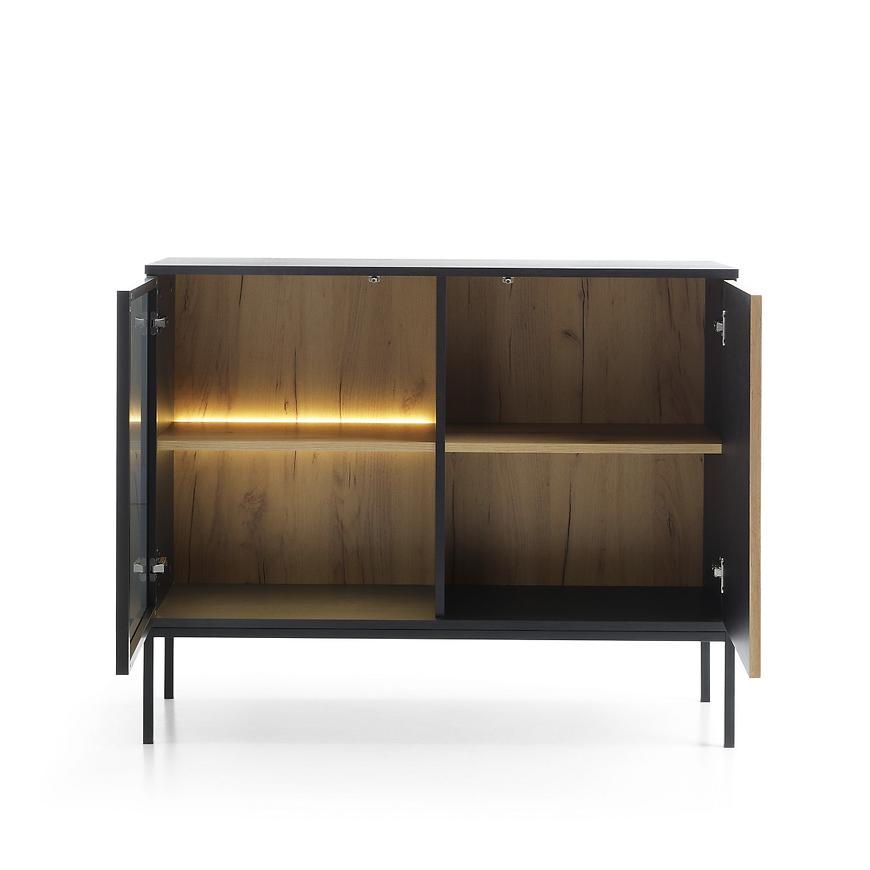Dwudrzwiowy układ komody zapewnia obfite miejsce do przechowywania, a dostępność oświetlenia LED w standardzie dodaje jej dodatkowego uroku, podkreślając piękno kolekcji Sento. Ten nowoczesny detal sprawia, że komoda staje się nie tylko funkcjonalnym meblem, ale również atrakcyjnym elementem dekoracyjnym w każdym pomieszczeniu.