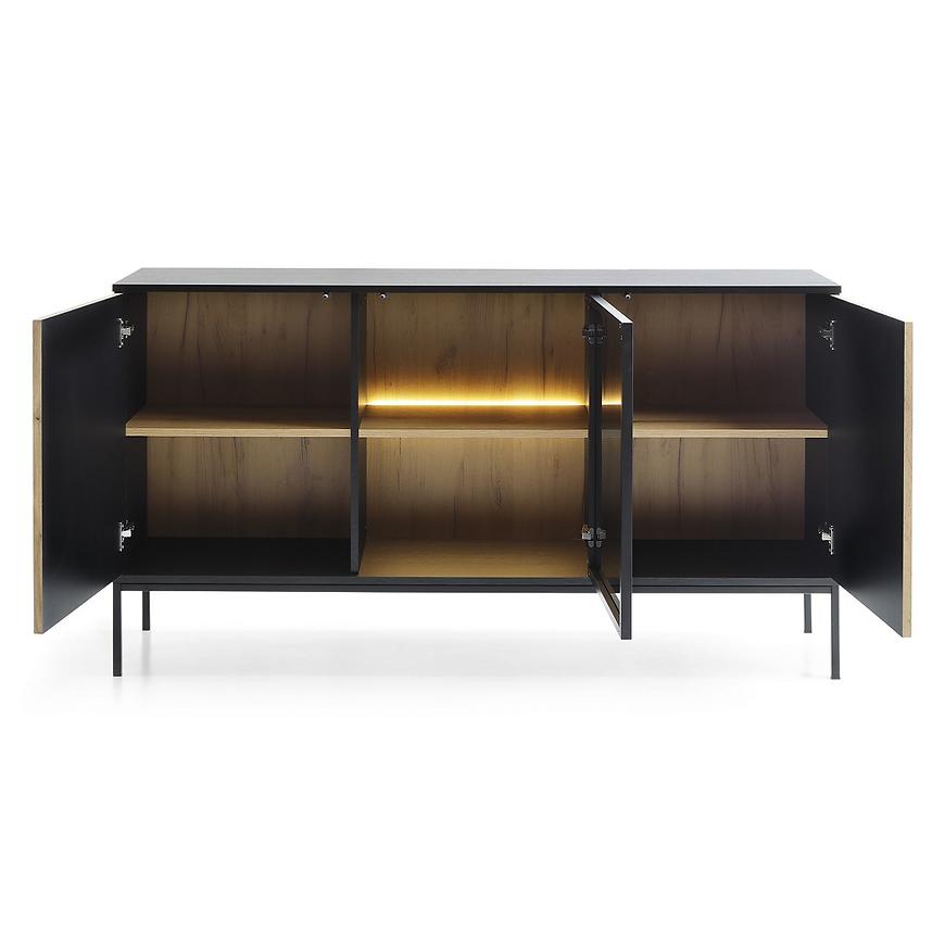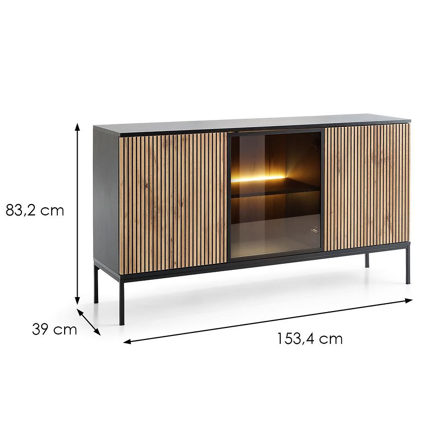 Fronty o ciepłym kolorze dębu wotan kontrastują z czarnym grafitowym korpusem, co nadaje meblowi wyjątkowego charakteru. Wykończenie w matowym stylu dodaje subtelności i elegancji całej kompozycji, podkreślając jej nowoczesny design.