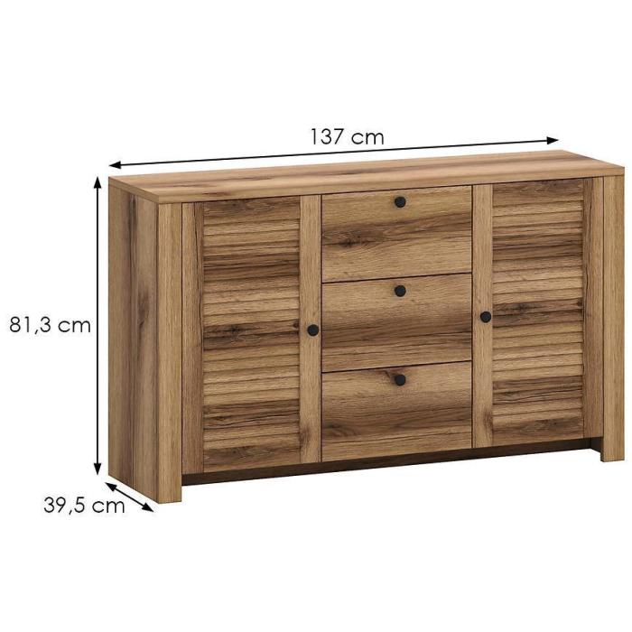 Komoda Sevilla w kolorze dąb delano ciemny to przede wszystkim nowoczesność i funkcjonalność w jednym. Mebel doskonale sprawdzi się w każdym salonie. Materiał wykonania to płyta wiórowa laminowana. Komoda posiada trzy szuflady i dwie szafki z półkami dzięki czemu ma łatwy dostęp do wnętrza. Wygląd mebli jest nowoczesny, a zarazem uniwersalny. Mebel będzie pasował do wielu pomieszczeń jak np. jadalni czy pokoju dziennego. Meble jest bardzo pojemny, dlatego sprawdzi się w każdym pomieszczeniu - zarówno w sypialni, pokoju dziennym, młodzieżowym, czy też salonie. Mebel do samodzielnego montażu.