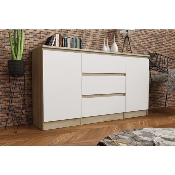 Doskonałym wyborem do pokoju dziennego będzie komoda w kolorze dąb sonoma/biały z serii Shine, materiał wykonania to płyta laminowana. Komoda posiada drzwiczki oraz szuflady, dzięki czemu ma łatwy dostęp do wnętrza. Komoda dopełni również wystrój salonu, czy przedpokoju, stanowiąc wygodne miejsce do przechowywania mniejszych i większych rzeczy. Mebel do samodzielnego montażu.