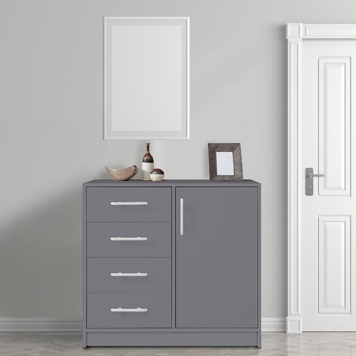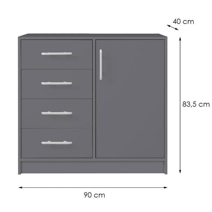 Komoda Smart to przede wszystkim nowoczesność i funkcjonalność w jednym. Mebel doskonale sprawdzi się w każdym salonie. Materiał wykonania to płyta wiórowa laminowana. Komoda posiada cztery szuflady oraz szafkę dzięki czemu ma łatwy dostęp do wnętrza. Wygląd mebli jest nowoczesny, a zarazem uniwersalny. Mebel będzie pasował do wielu pomieszczeń jak np. jadalni czy pokoju dziennego. Meble jest bardzo pojemny, dlatego sprawdzi się w każdym pomieszczeniu - zarówno w sypialni, pokoju dziennym, młodzieżowym, czy też salonie. Mebel do samodzielnego montażu.