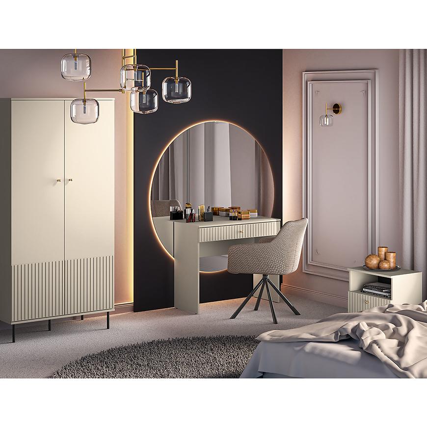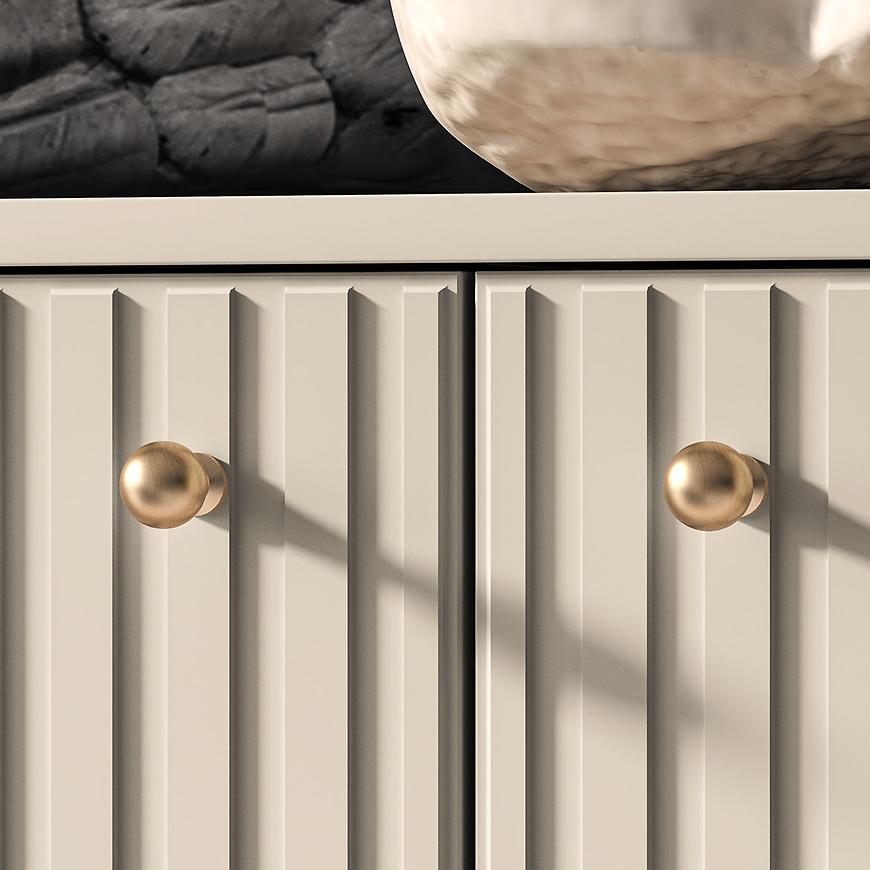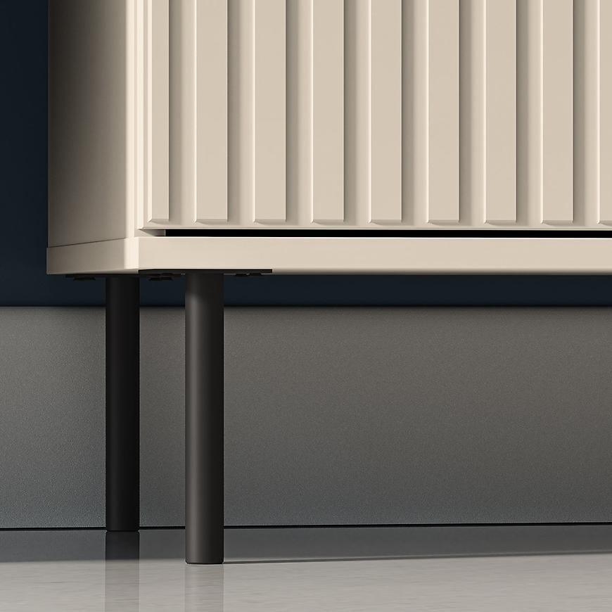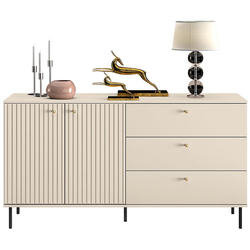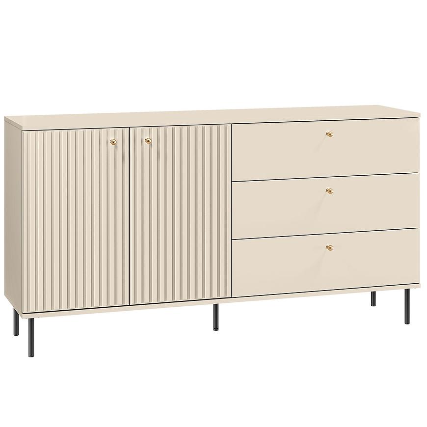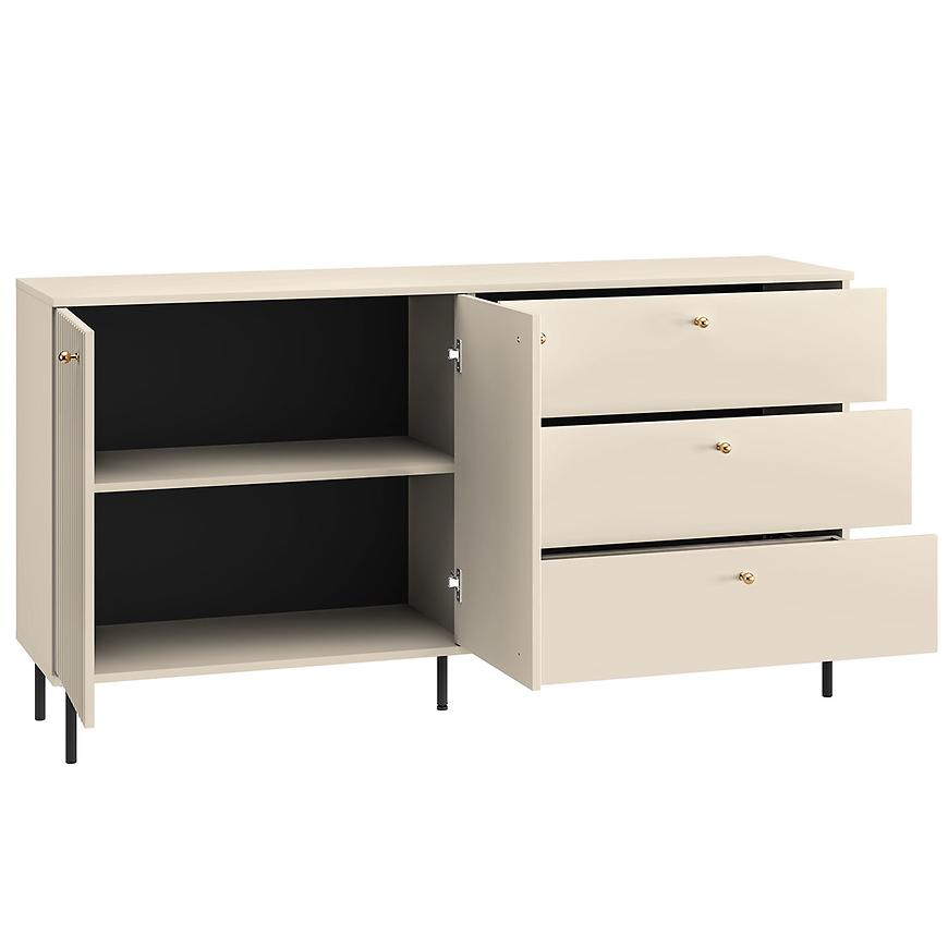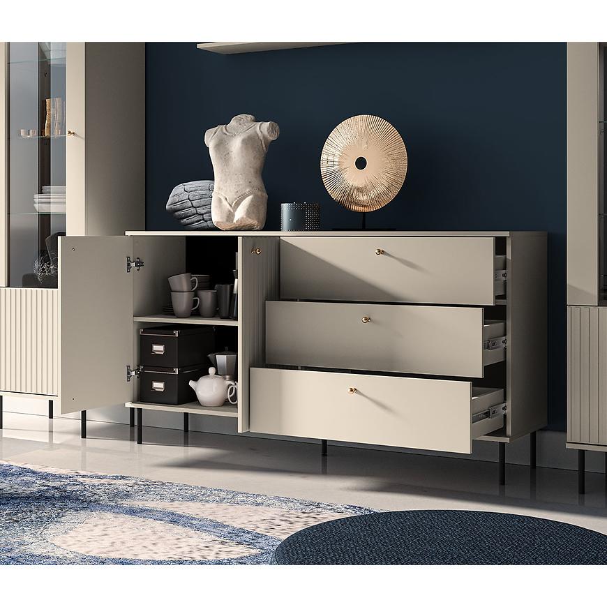 Kolorystyka i wykończenie: Komoda utrzymana jest w jednolitym, subtelnym odcieniu cashmere, który nadaje jej elegancji i nowoczesnego charakteru. Beżowe wybarwienie frontów i korpusu w połączeniu z matowym wykończeniem tworzy harmonijną i spójną całość, która doskonale komponuje się z różnymi aranżacjami wnętrz.
