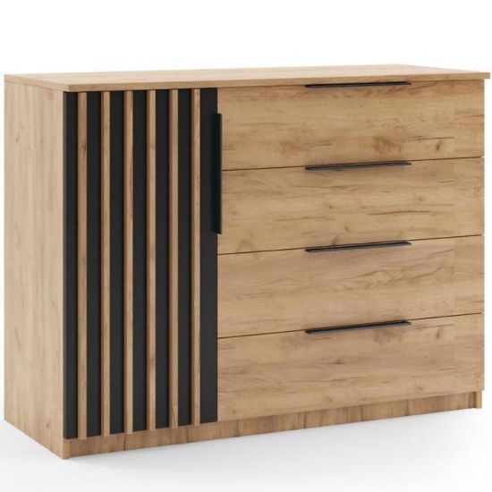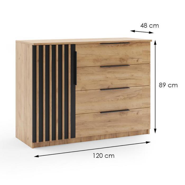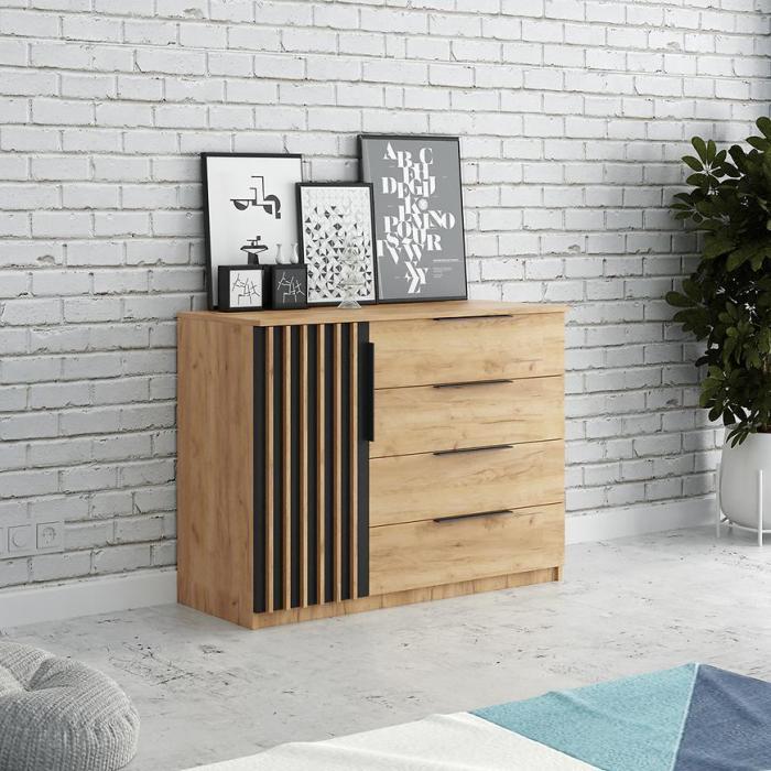 Doskonałym wyborem do pokoju dziennego będzie komoda w kolorze craft złoty/czarny z serii Sorento, materiał wykonania to płyta laminowana. Komoda posiada drzwiczki oraz szuflady, dzięki czemu ma łatwy dostęp do wnętrza. Komoda dopełni również wystrój salonu, czy przedpokoju, stanowiąc wygodne miejsce do przechowywania mniejszych i większych rzeczy. Mebel do samodzielnego montażu.