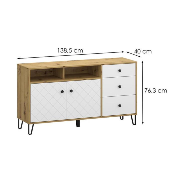 Komoda Sorrento w kolorze dąb artisan/biały to przede wszystkim nowoczesność i funkcjonalność w jednym. Mebel doskonale sprawdzi się w każdym salonie. Materiał wykonania to płyta wiórowa laminowana. Komoda posiada trzy szuflady i dwie szafki z półkami dzięki czemu ma łatwy dostęp do wnętrza. Wygląd mebli jest nowoczesny, a zarazem uniwersalny. Mebel będzie pasował do wielu pomieszczeń jak np. jadalni czy pokoju dziennego. Meble jest bardzo pojemny, dlatego sprawdzi się w każdym pomieszczeniu - zarówno w sypialni, pokoju dziennym, młodzieżowym, czy też salonie. Mebel do samodzielnego montażu.