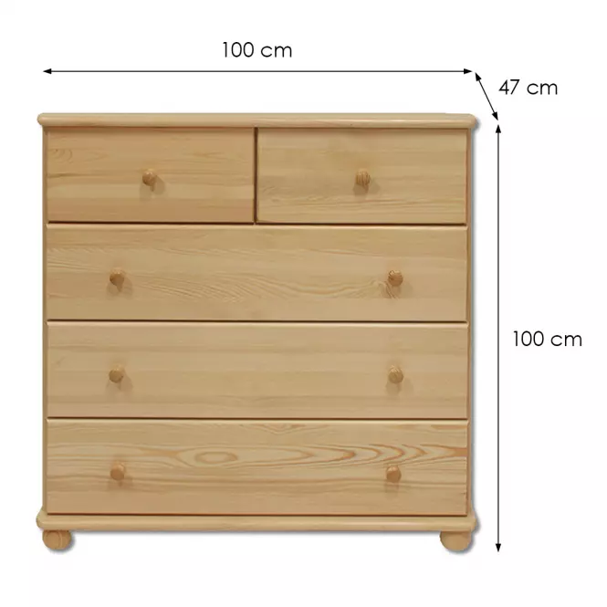 Komoda Sosnowa KD to klasyczny i elegancki mebel, który zachwyca naturalnym wyglądem oraz solidnym wykonaniem. W całości stworzona z drewna sosnowego, prezentuje surowe, jasne wybarwienie, co nadaje jej uniwersalny charakter idealnie wpisujący się w różnorodne aranżacje wnętrz. Matowe wykończenie frontów i korpusu podkreśla subtelną estetykę komody, wnosząc do pomieszczenia ciepły i przytulny klimat.