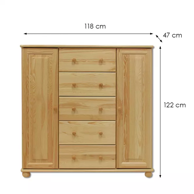 Komoda Sosnowa KD to klasyczny i elegancki mebel, który zachwyca naturalnym wyglądem oraz solidnym wykonaniem. W całości stworzona z drewna sosnowego, prezentuje surowe, jasne wybarwienie, co nadaje jej uniwersalny charakter idealnie wpisujący się w różnorodne aranżacje wnętrz. Matowe wykończenie frontów i korpusu podkreśla subtelną estetykę komody, wnosząc do pomieszczenia ciepły i przytulny klimat.
