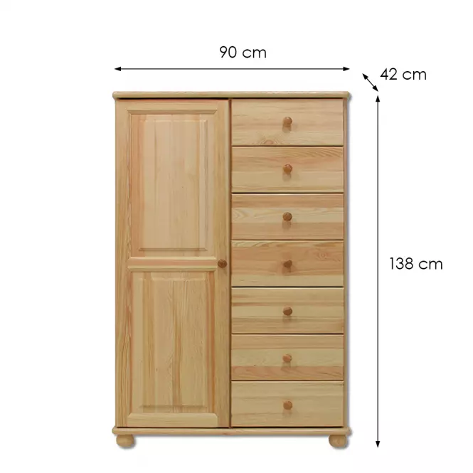 Komoda Sosnowa KD to klasyczny i elegancki mebel, który zachwyca naturalnym wyglądem oraz solidnym wykonaniem. W całości stworzona z drewna sosnowego, prezentuje surowe, jasne wybarwienie, co nadaje jej uniwersalny charakter idealnie wpisujący się w różnorodne aranżacje wnętrz. Matowe wykończenie frontów i korpusu podkreśla subtelną estetykę komody, wnosząc do pomieszczenia ciepły i przytulny klimat.