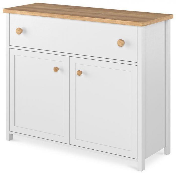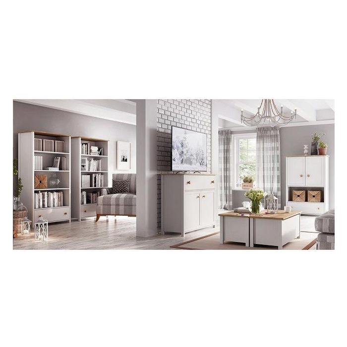 Doskonałym wyborem do pokoju dziennego będzie biała komoda w kolorze biały alpejski/dąb nash z serii Story. Materiał wykonania to płyta laminowana. Komoda posiada drzwiczki na zawias puszkowy oraz szufladę, dzięki czemu ma łatwy dostęp do wnętrza. Komoda dopełni również wystrój salonu, czy przedpokoju, stanowiąc wygodne miejsce do przechowywania mniejszych i większych rzeczy. Mebel do samodzielnego montażu.