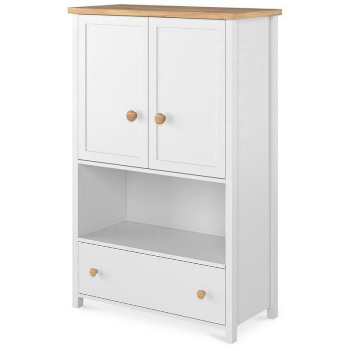Doskonałym wyborem do pokoju dziennego będzie biała komoda w kolorze biały alpejski/dąb nash z serii Story. Materiał wykonania to płyta laminowana. Komoda posiada drzwiczki na zawias puszkowy oraz szufladę, półkę dzięki czemu ma łatwy dostęp do wnętrza. Komoda dopełni również wystrój salonu, czy przedpokoju, stanowiąc wygodne miejsce do przechowywania mniejszych i większych rzeczy. Mebel do samodzielnego montażu.