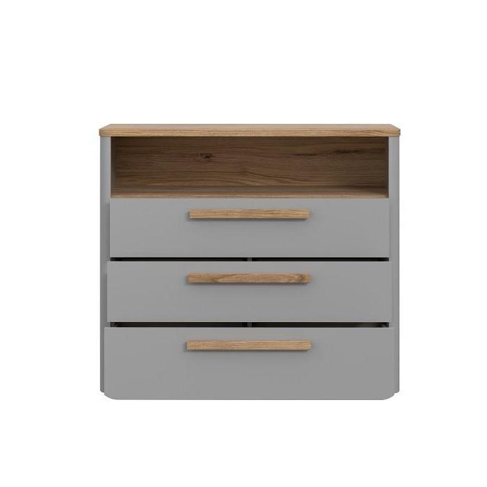 Kolekcja mebli młodzieżowych Surfinio to kompleksowa odpowiedź na potrzeby nastolatków. Odznacza się intersującym lecz prostym designem. Chłodny kolor szarości połączony został z kolorem dąb catania, dzięki temu pokój nabiera przytulności. Pojemna szafa i komoda z szufladami pomieszczę potrzebne rzeczy oraz pozwolą na utrzymanie porządku. System posiada duże wygodne uchwyty które są również elementem ozdobnym. W skład systemu Surfinio wchodzą: biurko, komoda z szufladami, regał, duża szafa ubraniowa, szafka nocna, półka wisząca oraz łóżko do którego można dodatkowo zakupić pojemną szufladę na pościel. Mebel do samodzielnego montażu.
