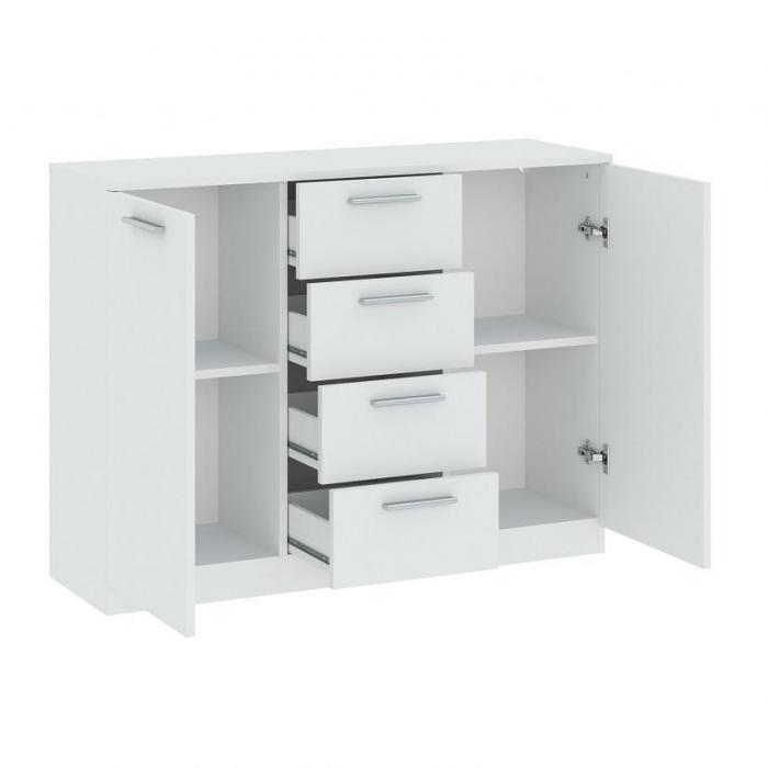Komoda Surrey to ciekawy mebel idealny do sypialni lub przedpokoju. Komoda dzięki klasycznemu dekorowi biały mat wpasuje się w wiele aranżacji w nowoczesnych wnętrzach jak również we wnętrzach klasycznych. Surrey to komoda, z dodatkowymi półkami umieszczonymi za otwieranymi drzwiami. Szafka posiada cztery szuflady oraz drzwiczki dzięki czemu ma łatwy dostęp do wnętrza oraz odpowiednią przestrzeń do przechowywania odzieży lub innych przedmiotów. Całość wykonana z płyty laminowanej, uchwyty w kolorze srebrnym wykonane w tworzywa. W szufladach zastosowano prowadnice kulkowe, metalowe. Do kompletu można dokupić inne modele z kolekcji.