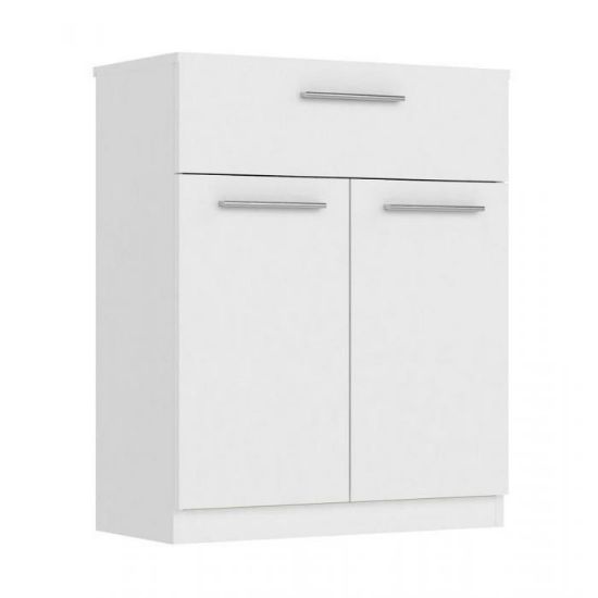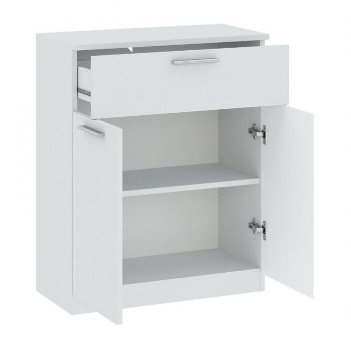Komoda Surrey to ciekawy mebel idealny do sypialni lub przedpokoju. Komoda dzięki klasycznemu dekorowi biały mat wpasuje się w wiele aranżacji w nowoczesnych wnętrzach jak również we wnętrzach klasycznych. Surrey to komoda, z dodatkową półką umieszczona za otwieranymi drzwiami. Szafka posiada jedną szufladę oraz drzwiczki dzięki czemu ma łatwy dostęp do wnętrza oraz odpowiednią przestrzeń do przechowywania odzieży lub innych przedmiotów. Całość wykonana z płyty laminowanej, uchwyty w kolorze srebrnym wykonane w tworzywa. W szufladach zastosowano prowadnice kulkowe, metalowe. Do kompletu można dokupić inne modele z kolekcji.