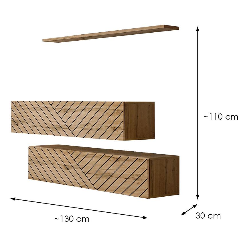 Zestaw ma szerokość 130 cm, co zapewnia wystarczająco dużo miejsca do przechowywania różnych rzeczy. Jego wysokość wynosi 110 cm, a głębokość 30 cm, co czyni zestaw idealny do umieszczenia go w różnych wnętrzach, takich jak salon, sypialnia czy przedpokój. Wnętrze komody pozwala na efektywne organizowanie przechowywanych przedmiotów. Dodatkowo, front komody jest frezowany, co dodaje mu wyjątkowego charakteru. W skład zestawu wchodzi również półka ścienna wisząca w kolorze wotan, dzięki której wyeksponujesz swoje dekoracje czy pamiątki.