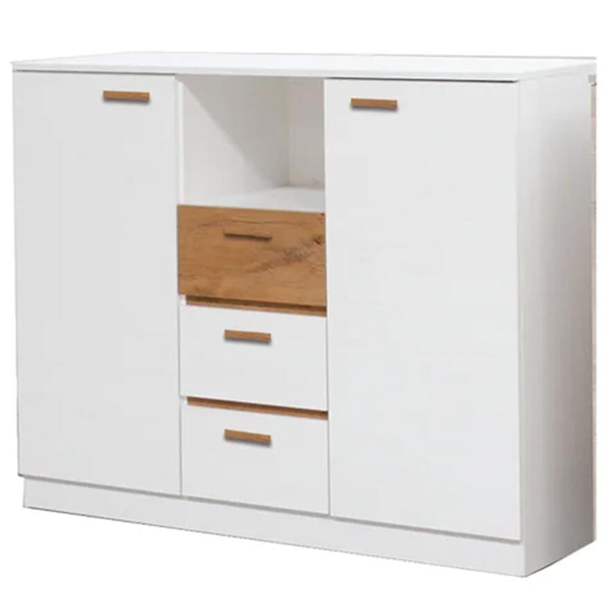 Konstrukcja komody wykonana jest z laminowanej płyty wiórowej, co gwarantuje stabilność i wytrzymałość na lata użytkowania. Trzy przestronne szuflady oraz dwie drzwiowe komory umożliwiają wygodne przechowywanie odzieży, dokumentów, dodatków czy dekoracji, zapewniając porządek w każdym wnętrzu. Dzięki przemyślanej konstrukcji każdy element mebla jest łatwo dostępny, a organizacja przestrzeni staje się intuicyjna.