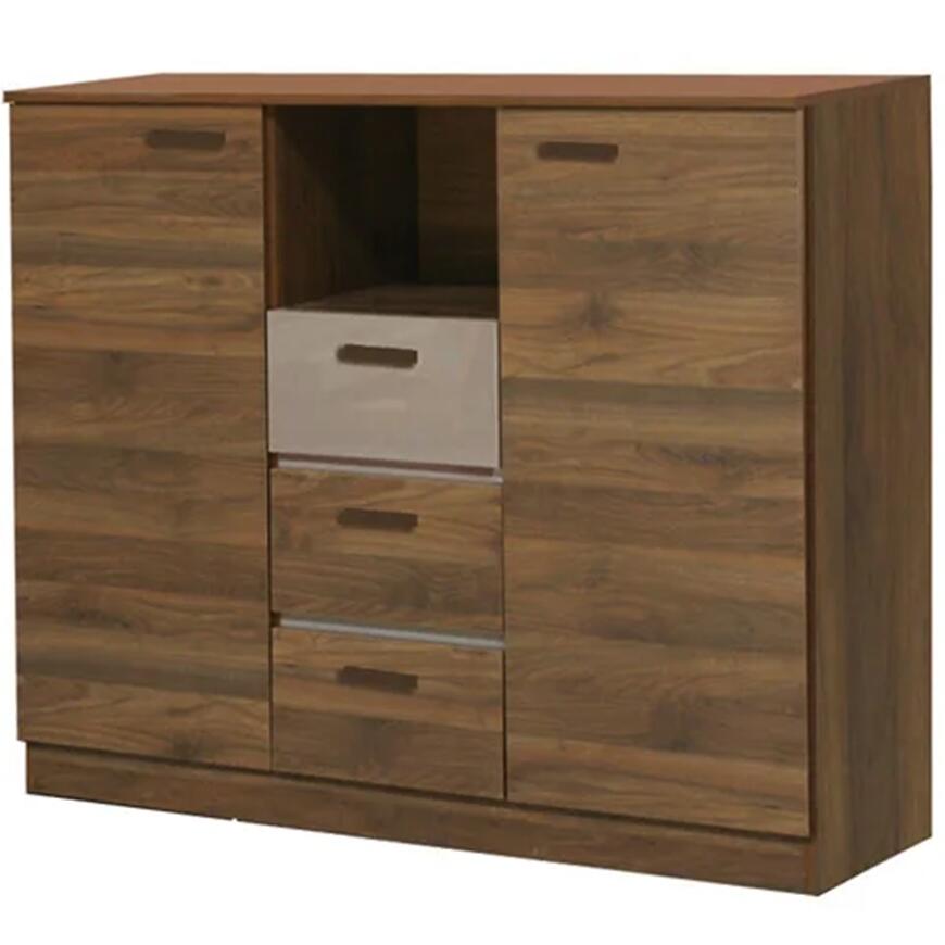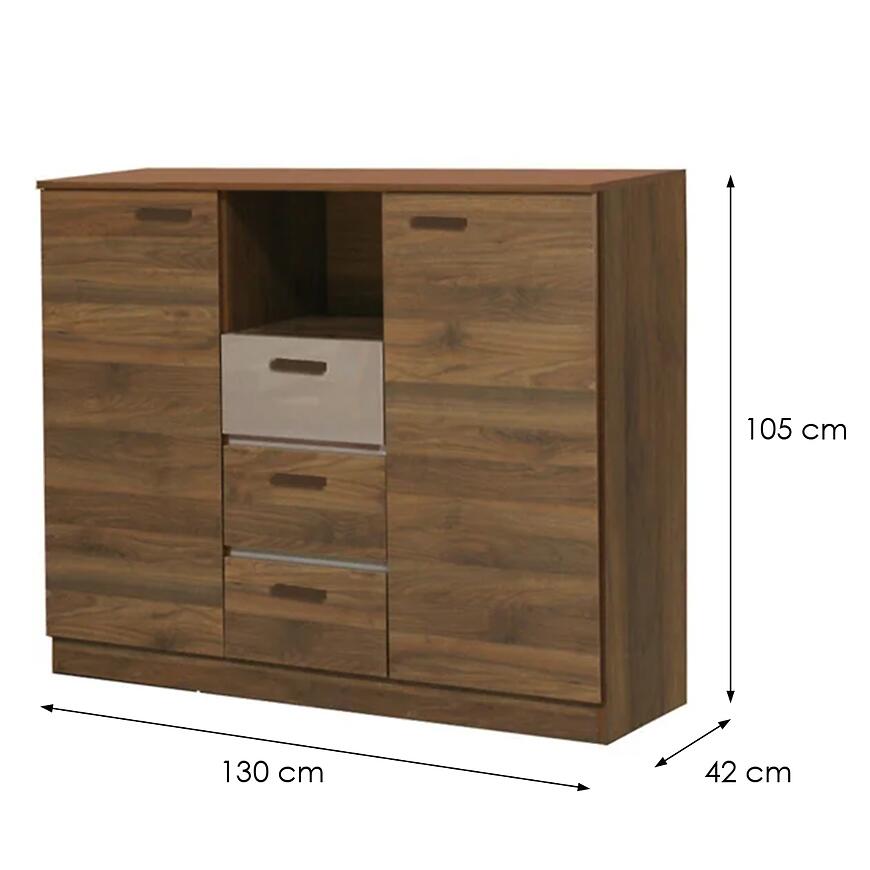 Konstrukcja komody wykonana jest z laminowanej płyty wiórowej, co gwarantuje stabilność i wytrzymałość na lata użytkowania. Trzy przestronne szuflady oraz dwie drzwiowe komory umożliwiają wygodne przechowywanie odzieży, dokumentów, dodatków czy dekoracji, zapewniając porządek w każdym wnętrzu. Dzięki przemyślanej konstrukcji każdy element mebla jest łatwo dostępny, a organizacja przestrzeni staje się intuicyjna.