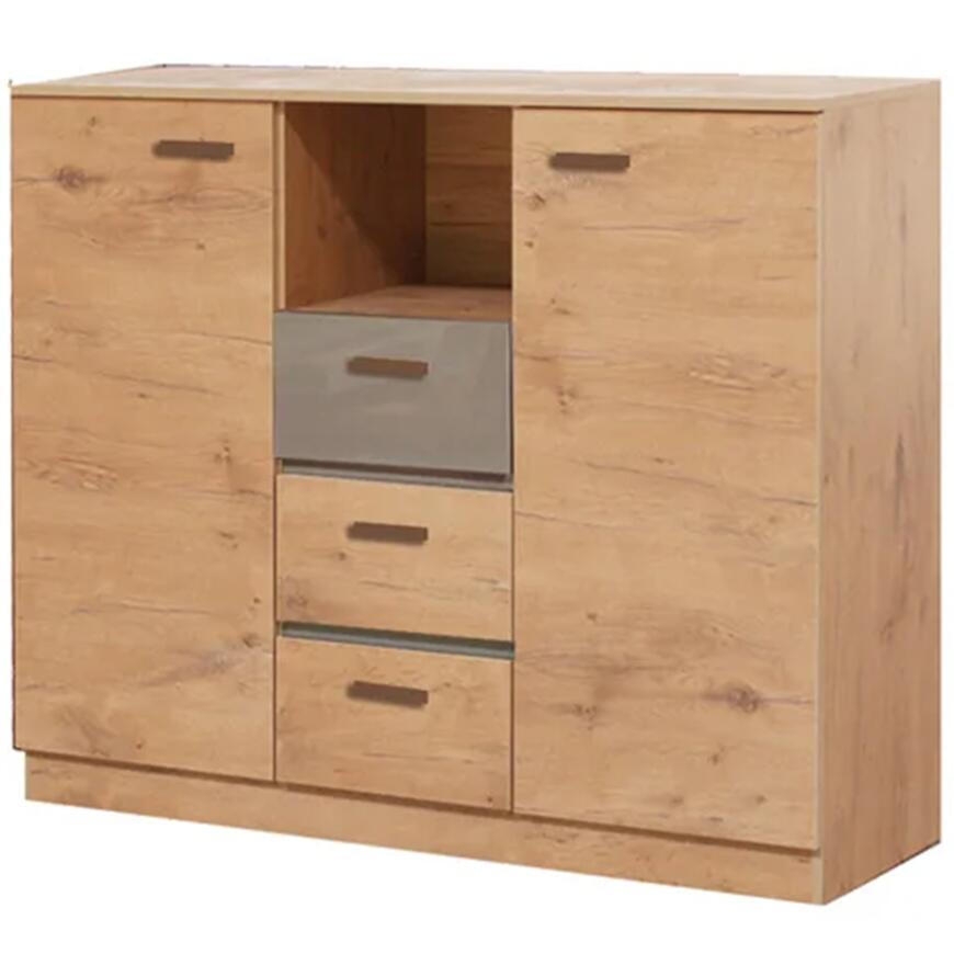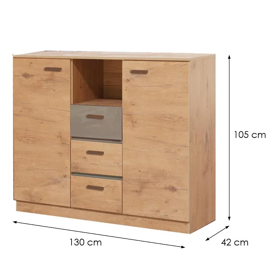 Konstrukcja komody wykonana jest z laminowanej płyty wiórowej, co gwarantuje stabilność i wytrzymałość na lata użytkowania. Trzy przestronne szuflady oraz dwie drzwiowe komory umożliwiają wygodne przechowywanie odzieży, dokumentów, dodatków czy dekoracji, zapewniając porządek w każdym wnętrzu. Dzięki przemyślanej konstrukcji każdy element mebla jest łatwo dostępny, a organizacja przestrzeni staje się intuicyjna.