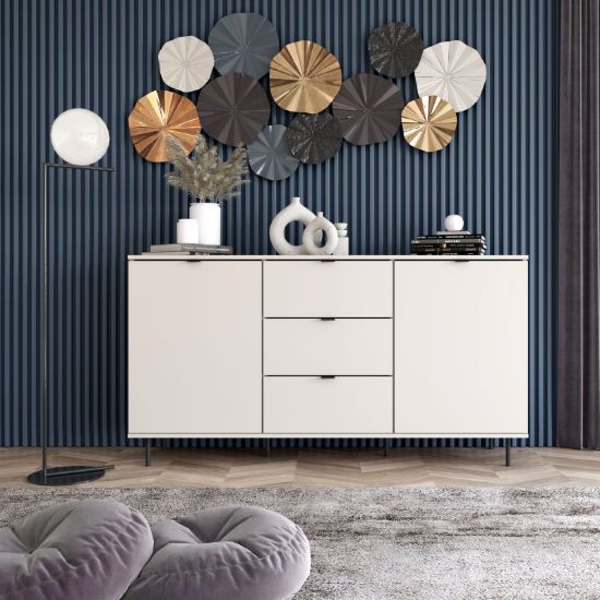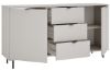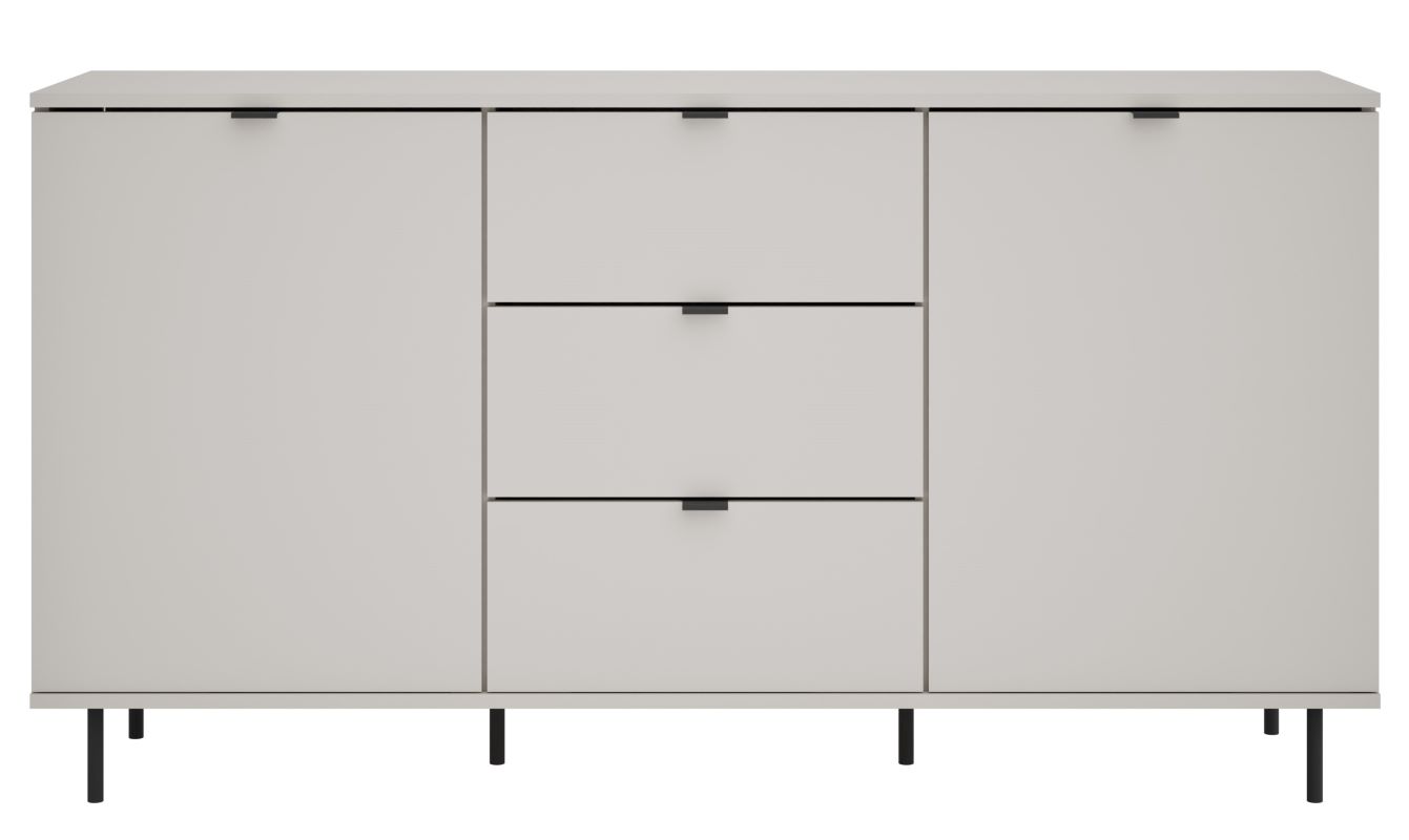 Komoda szeroka Galia 2D3S Typ 2 w kolorze kaszmir to elegancki i funkcjonalny mebel, który łączy klasyczny design z praktycznym zastosowaniem. W całości wykonana z płyty meblowej, zarówno fronty, jak i korpus posiadają matowe wykończenie, nadając komodzie subtelny i ponadczasowy charakter. Model wyposażono w dwudrzwiowe fronty oraz trzy pojemne szuflady z prowadnicami kulkowymi i funkcją cichego domyku, a wewnątrz znajdują się dwie półki, co zapewnia dodatkowe miejsce do przechowywania odzieży, akcesoriów i innych przedmiotów. Komoda stoi na solidnych metalowych nogach, a metalowe uchwyty szuflad podkreślają trwałość i estetykę mebla.