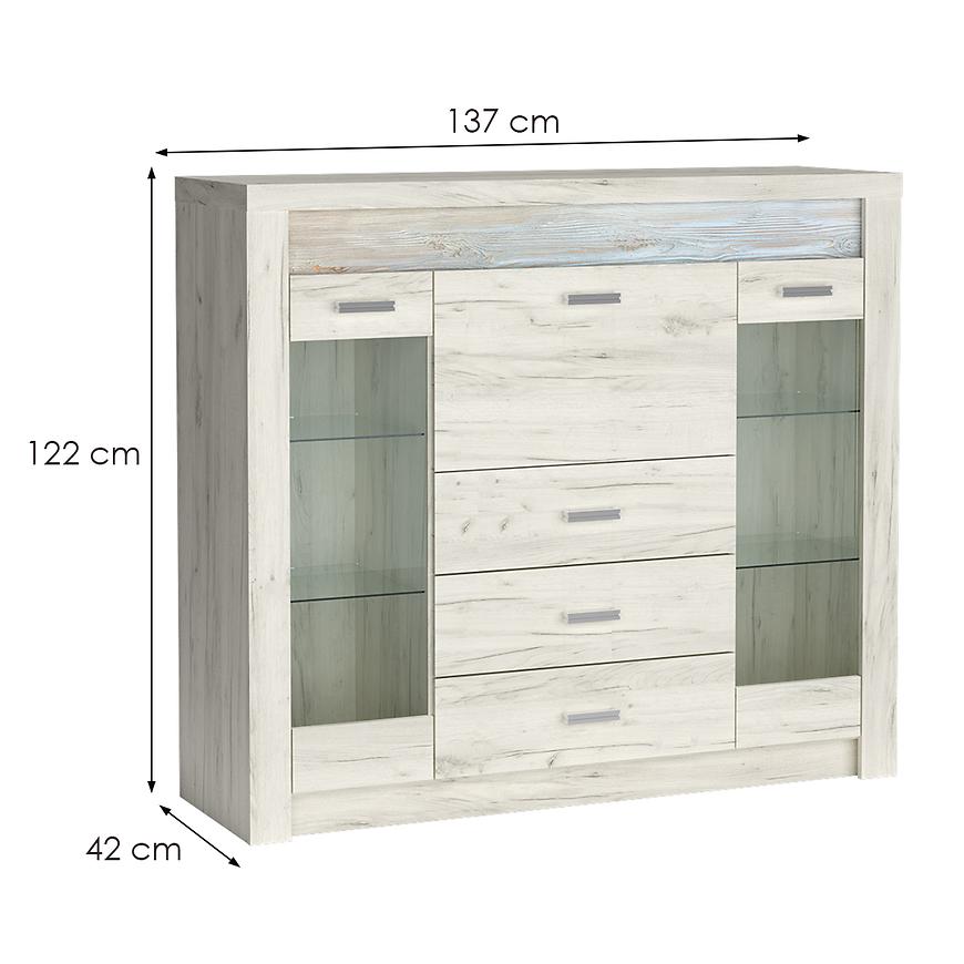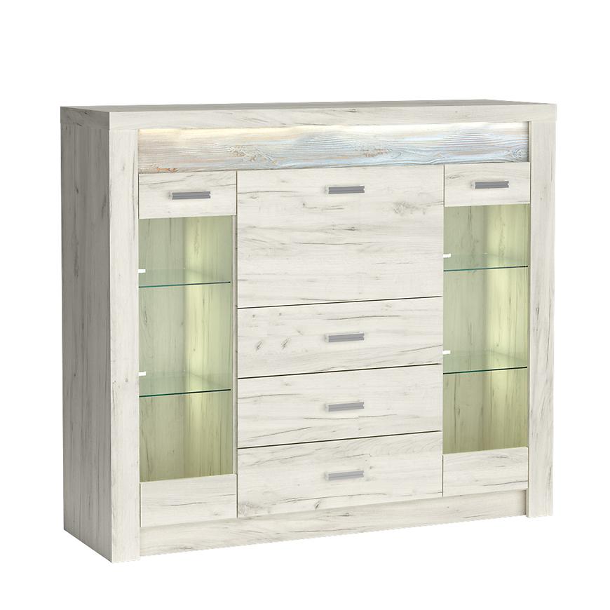 Doskonałym wyborem do pokoju dziennego będzie komoda w kolorze kraft biały z kolekcji Indianapolis , materiał wykonania to płyta laminowana. Komoda posiada drzwiczki oraz szuflady, dzięki czemu ma łatwy dostęp do wnętrza. Komoda dopełni również wystrój salonu, stanowiąc wygodne miejsce do przechowywania mniejszych i większych rzeczy. Mebel do samodzielnego montażu. Dodatkowe informacje: Opcja LED blat oraz LED półki. Polecane oświetlenie: 3303762