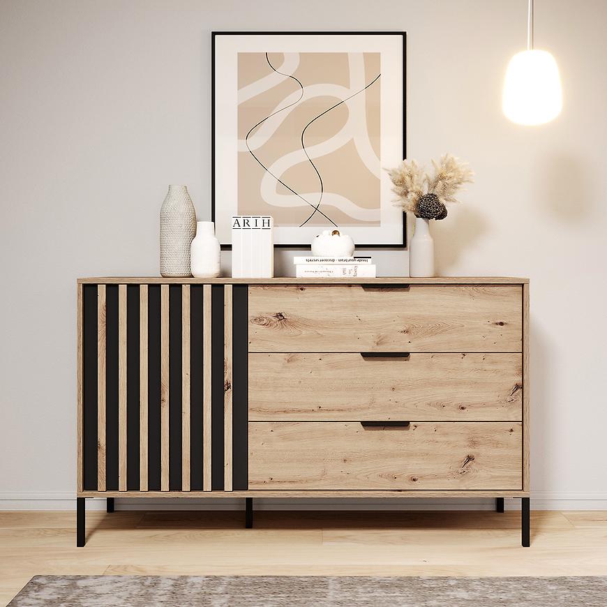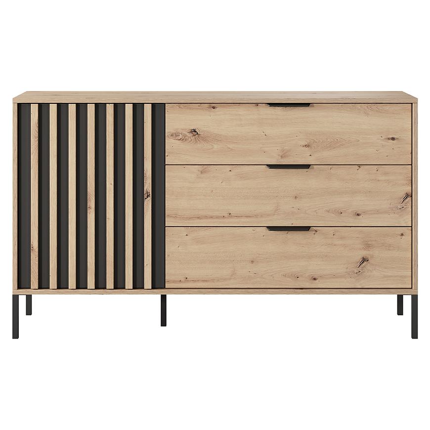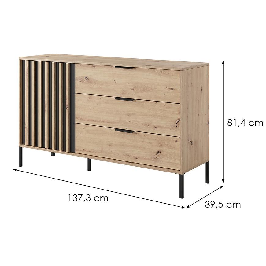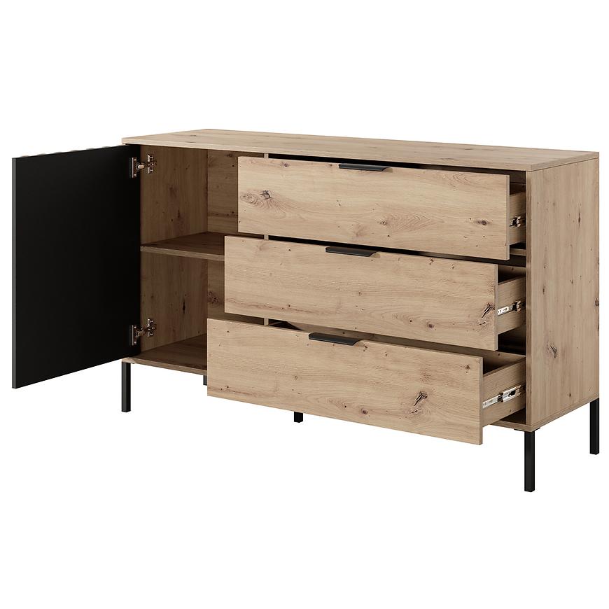 Komoda wyposażona jest w 3 szuflady oraz szafkę z drzwiami i półką, co pozwala na przechowywanie różnorodnych przedmiotów, zachowując jednocześnie porządek i harmonię w pomieszczeniu. Wykończenie matowe nadaje meblowi elegancki wygląd, jednocześnie zapewniając trwałość i odporność na uszkodzenia.